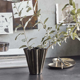 Een stoere metalen vaas met een antieke afwerking – perfect voor een veldboeket of droogbloemen. De warme bruine kleur contrasteert prachtig met lichte zomertinten. -