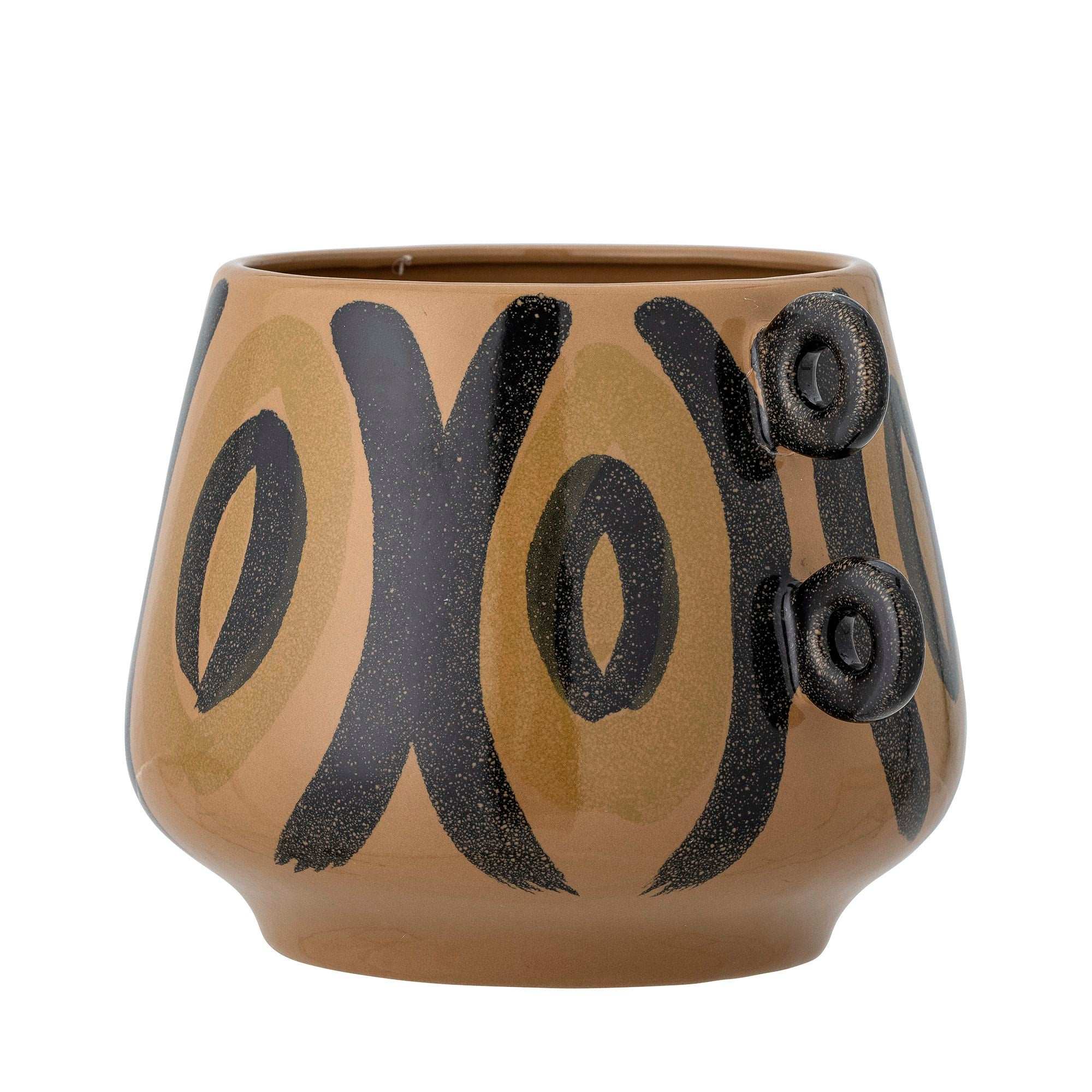 Detaljer & materiale: Fremstillet af stentøj i en dyb brun nuance med glaseret inderside for en pæn og holdbar finish. Størrelsen b × h × d 18 × 13 × 24,5 cm gør potten velegnet til små planter uden at optage for meget plads. Det legende sorte mønster og de to dekorative arme skaber visuel balance og giver urtepotten karakter, mens den rolige farve er nem at kombinere med andre materialer.