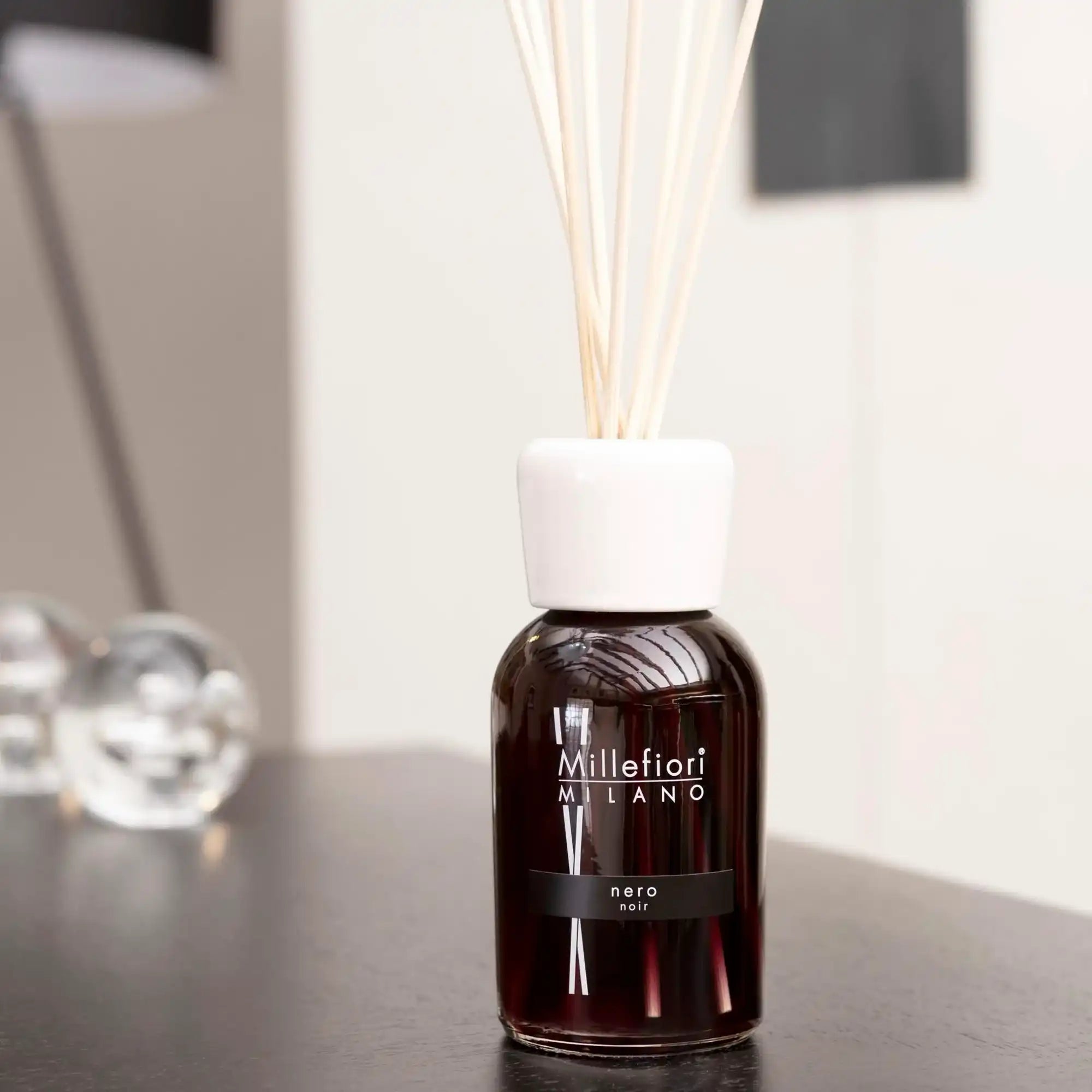 Med Millefiori Nero duftpinde på 250 ml bringer du en krydret duft ind i hjemmet. Nero-duften fra Natural-kollektionen dufter af aromatisk timian og patchouli. Disse hovednoter er subtilt blandet med duften af vanilje, kanel og musk.