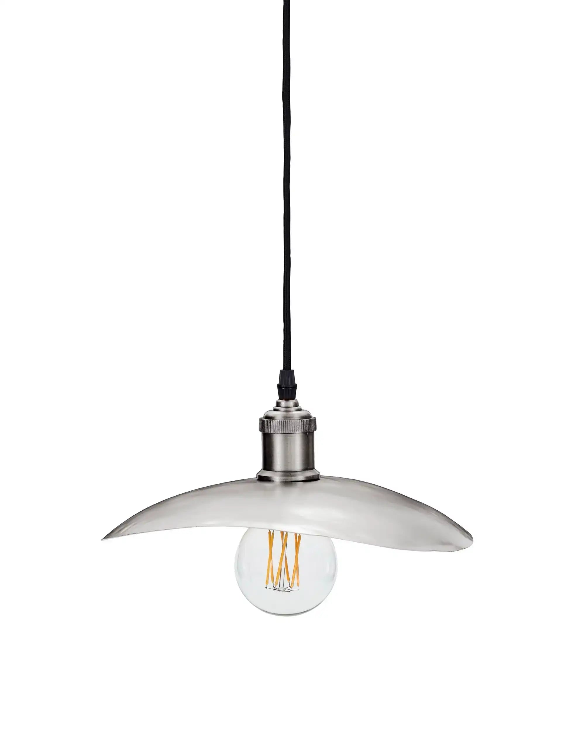 Hatt er fremstillet af jern og har en elegant sølvfarvet overflade med en diskret børstet effekt. Skærmen er 30 cm lang, 28 cm bred og kun 4,5 cm høj. Den flade form spreder lyset bredt, hvilket giver en varm og rolig stemning i rummet. Designet til brug som loftslampe og kan kombineres med en løs fatning.