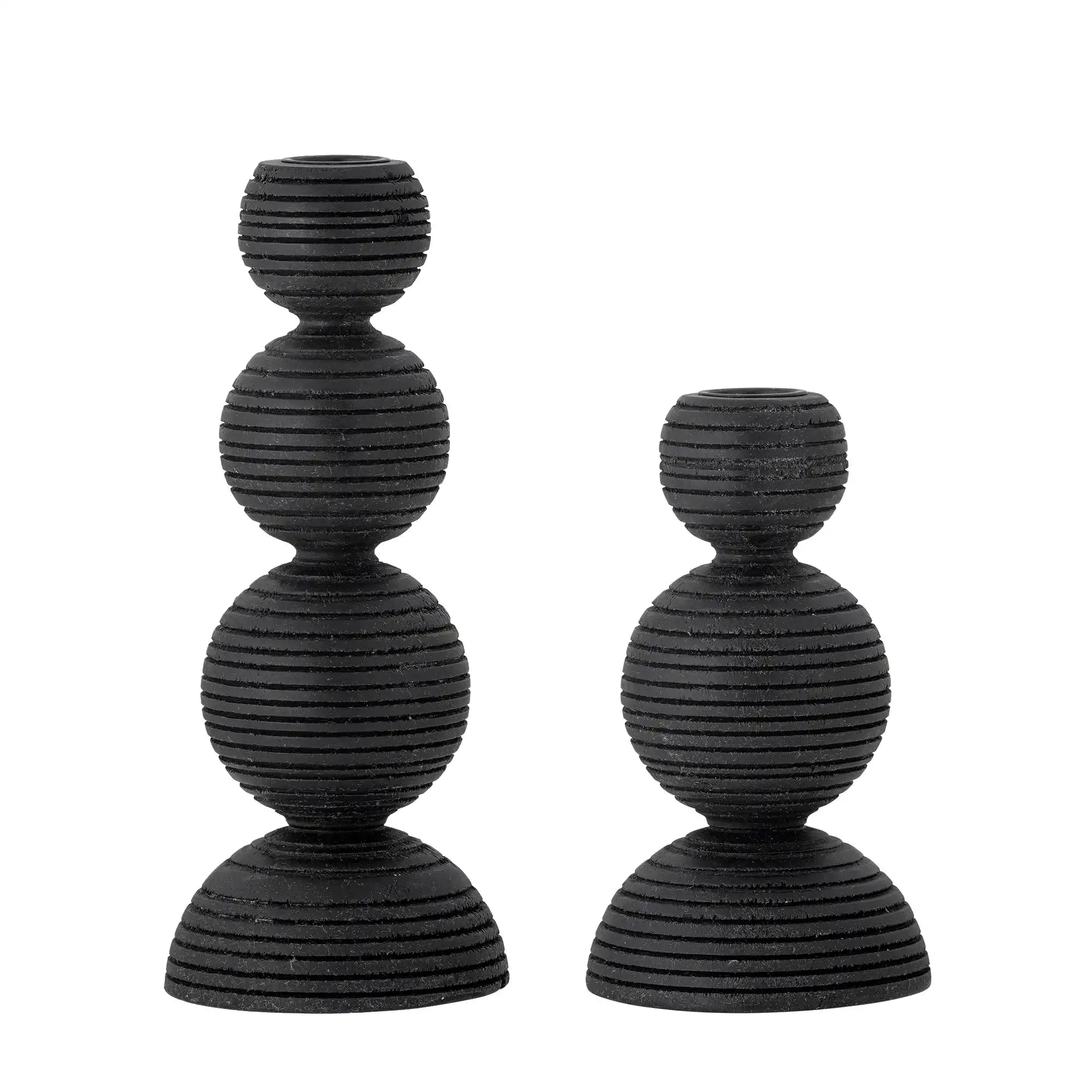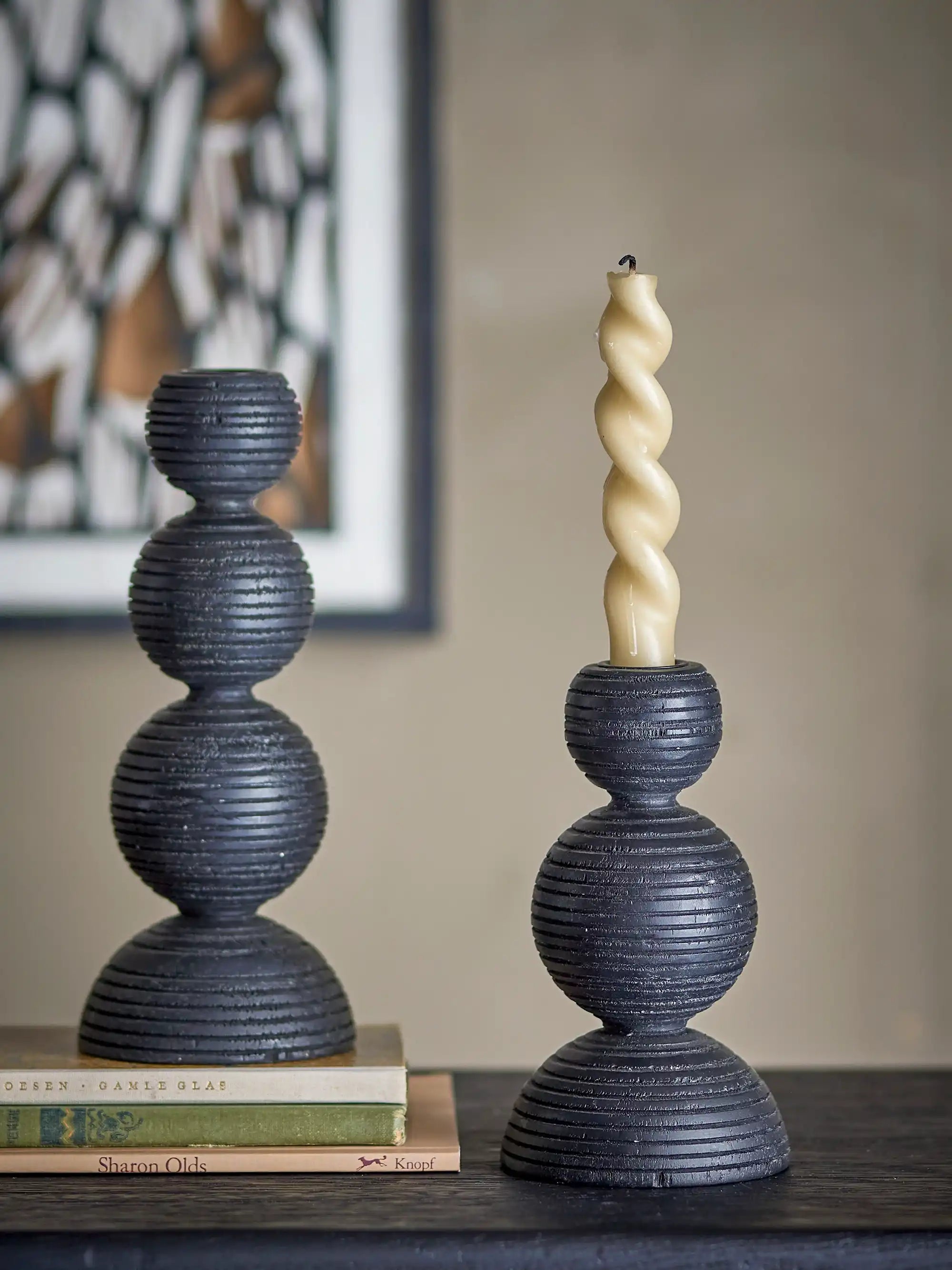 Detaljer & materiale: Lysestagerne er fremstillet af massivt fyrretræ og har en mat, sort finish, der smukt fremhæver træets struktur. De subtile linjer og det skulpturelle design gør dem til et særligt blikfang uden at dominere rummet. Med en højde på 22 cm og en diameter på 9 cm er de perfekte både som par og hver for sig.