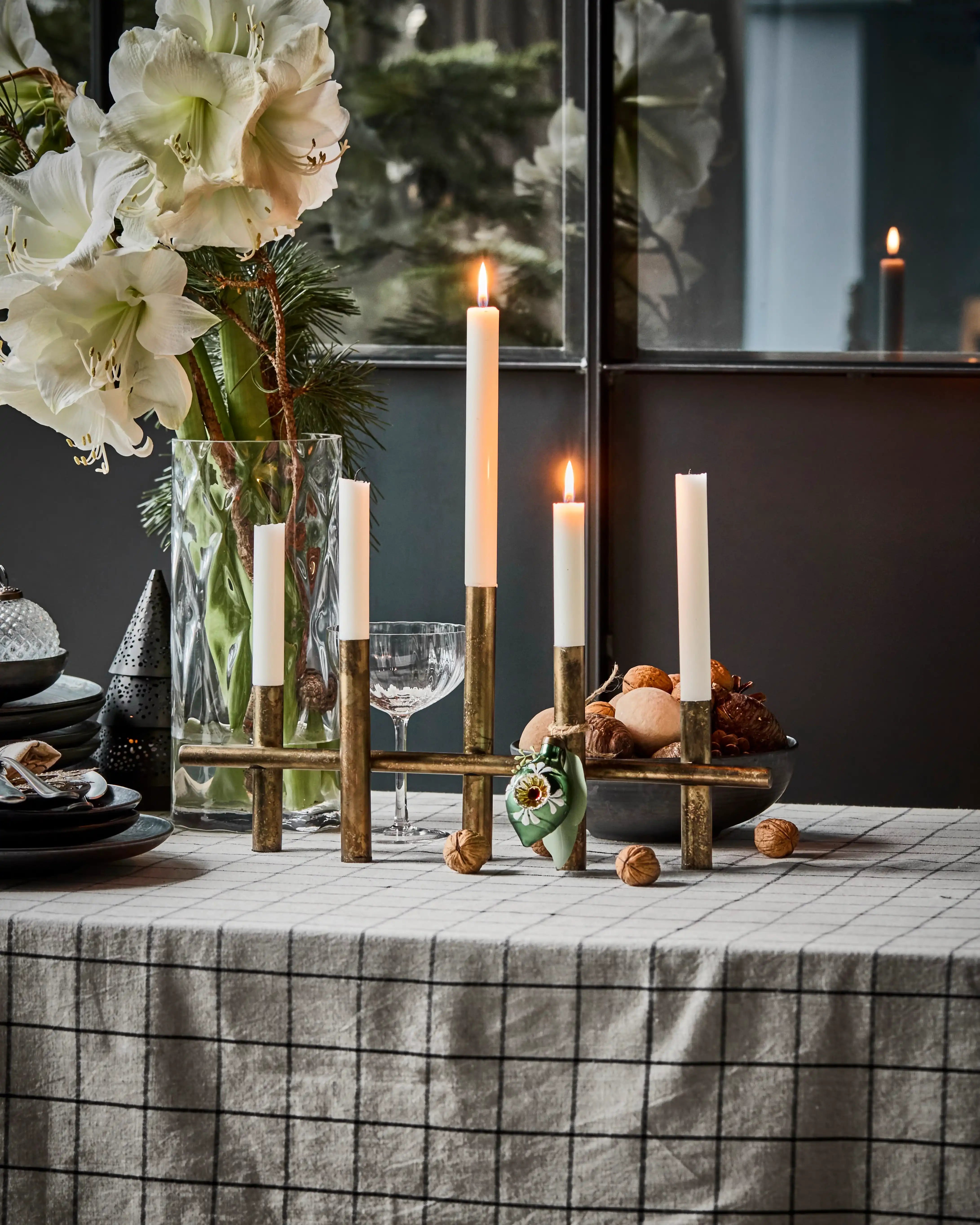 Tip: Sæt kandelaberen sammen med slanke lys i varme nuancer og tilføj naturmaterialer som grangrene eller en linneddug for en enkel, men festlig stemning.