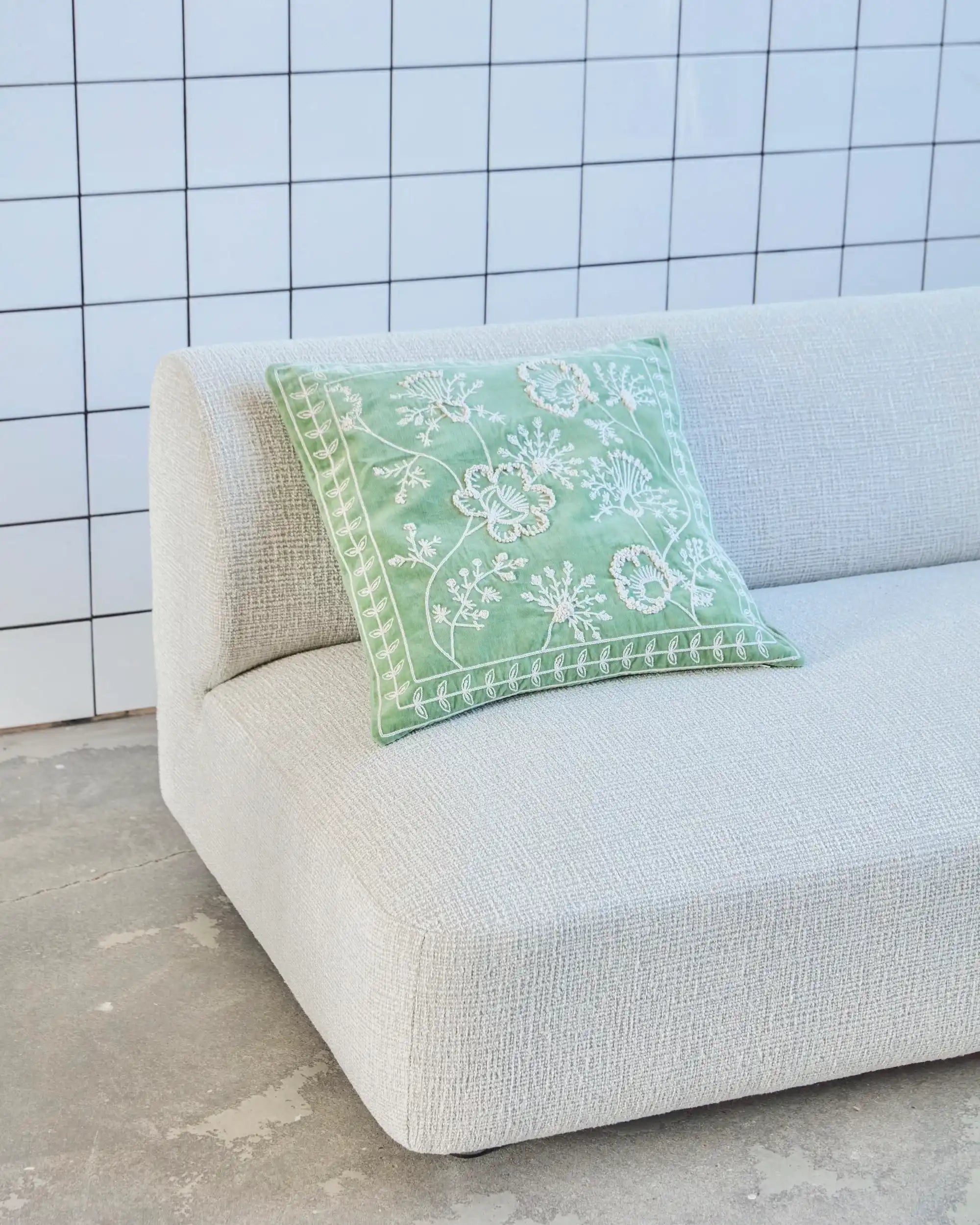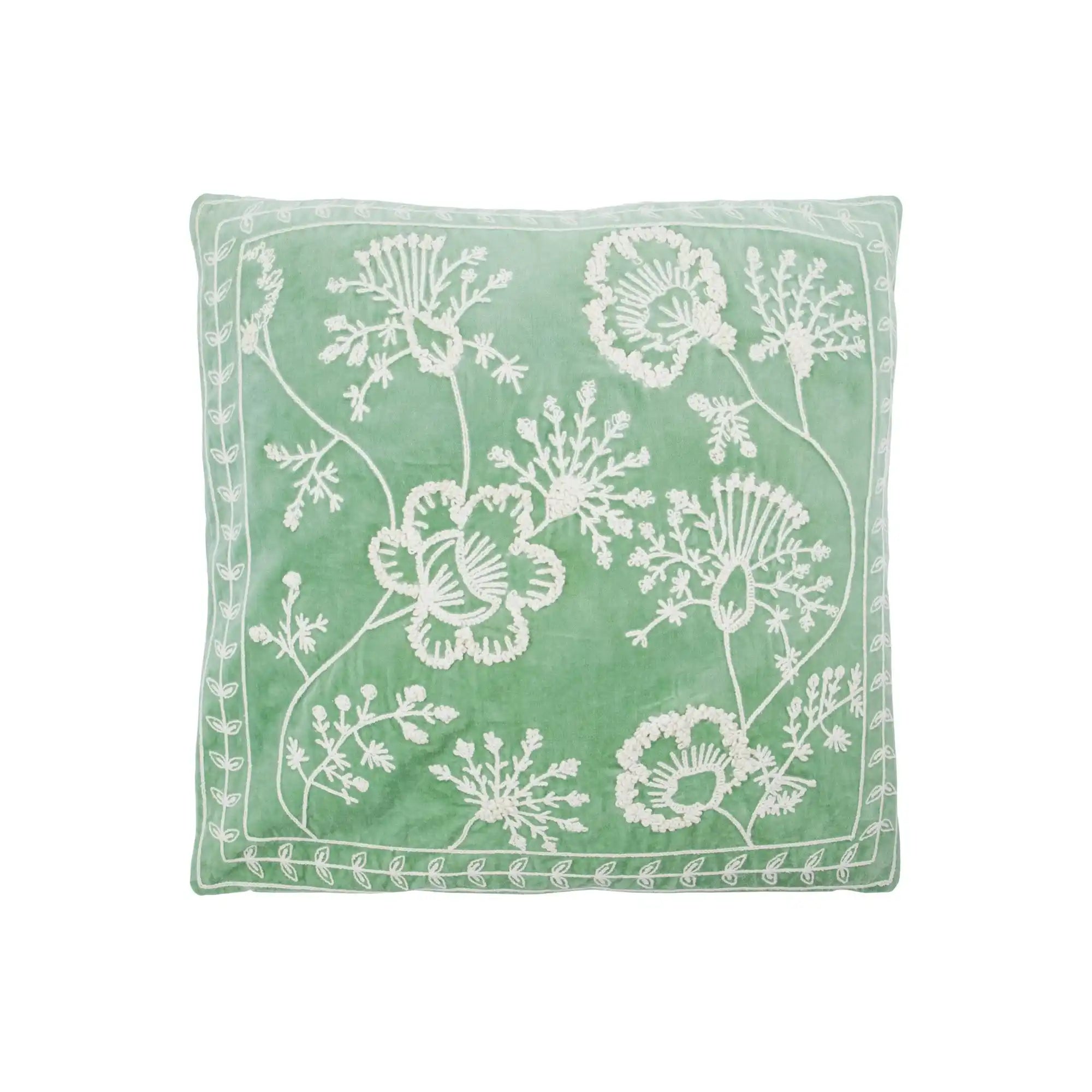 Betrækket er lavet af 100% bomuld og føles blødt, men robust. På den mintgrønne baggrund træder det sandfarvede broderi – et botanisk motiv med struktur – smukt frem. Med målene 50 x 50 cm passer betrækket perfekt til standard pyntepuder.