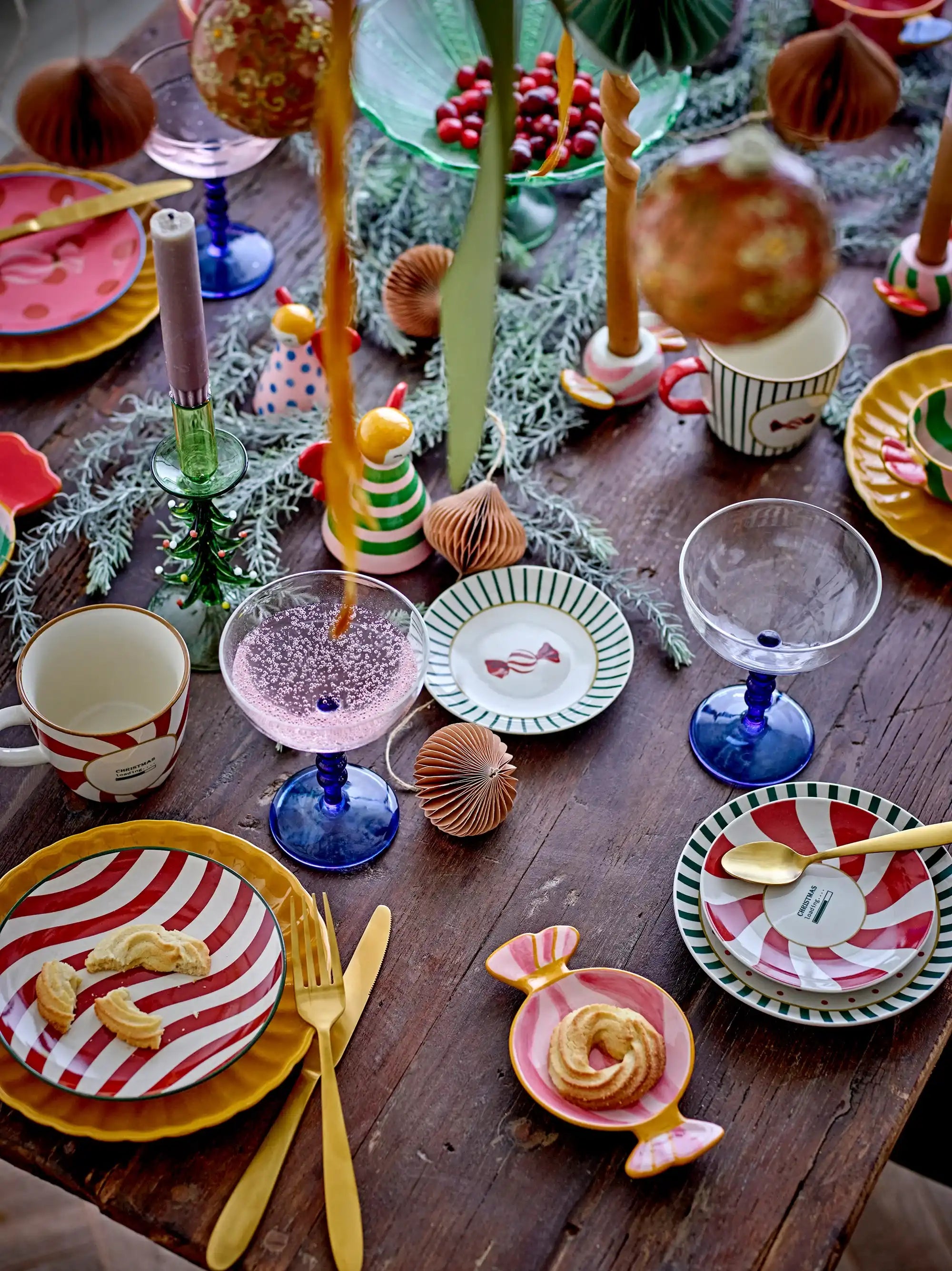 Giv dine vintermorgener et festligt præg med dette sæt af to julekrus. Hvert krus har sin egen charme: det ene er dekoreret med en rød-hvid spiral og teksten Christmas loading…, det andet har grøn-hvide striber med et sødt slik i midten. Sammen udgør de et muntert par, der straks giver dig den varme decemberstemning.