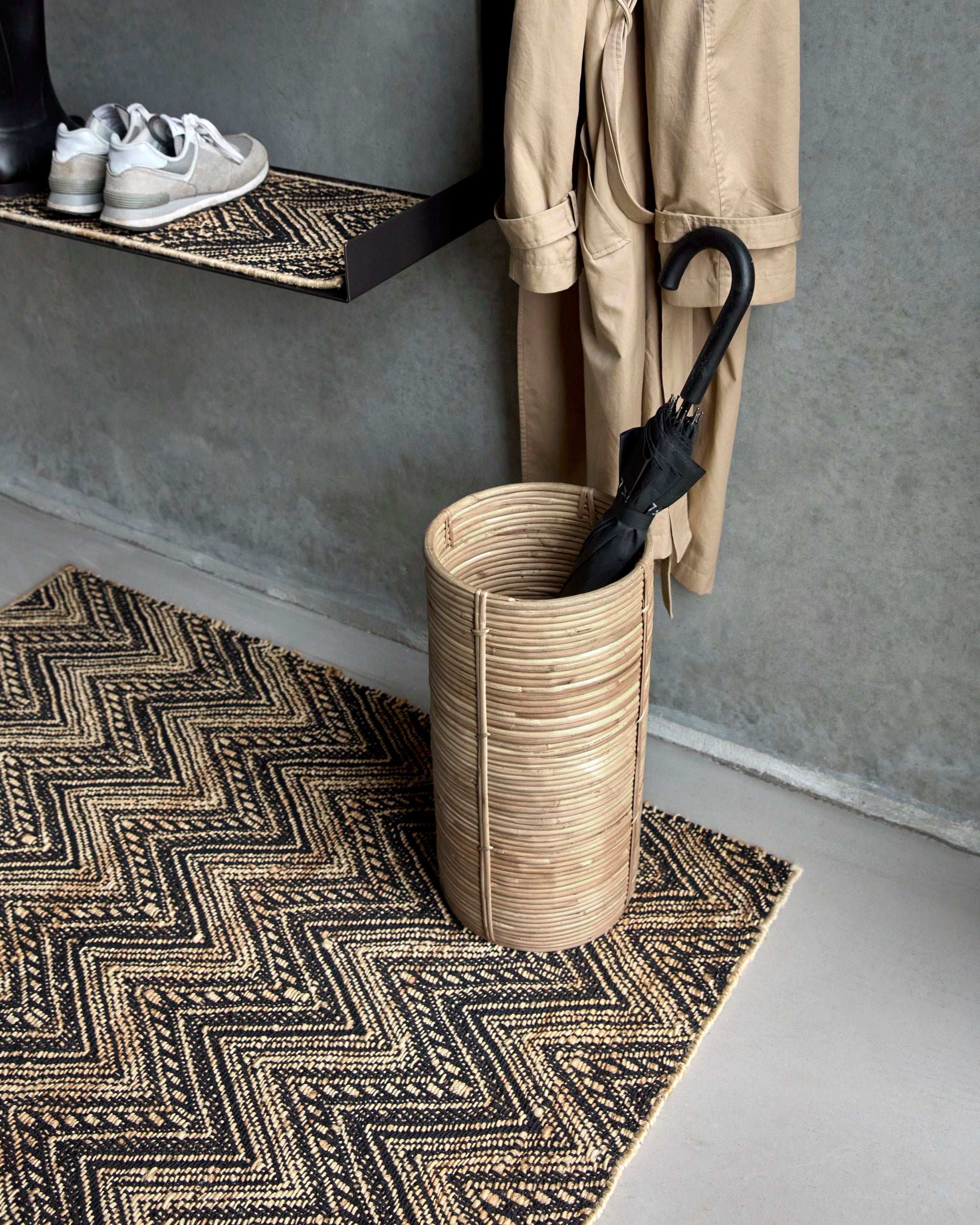 Med en højde på 50 cm er denne kurv perfekt som paraplyholder ved hoveddøren, men den er også velegnet til opbevaring af stokke, gavepapirsruller eller endda som dekorativ kurv til tørrede grene. Den åbne struktur sikrer luftcirkulation og forhindrer fugt, mens det robuste materiale garanterer lang holdbarhed.