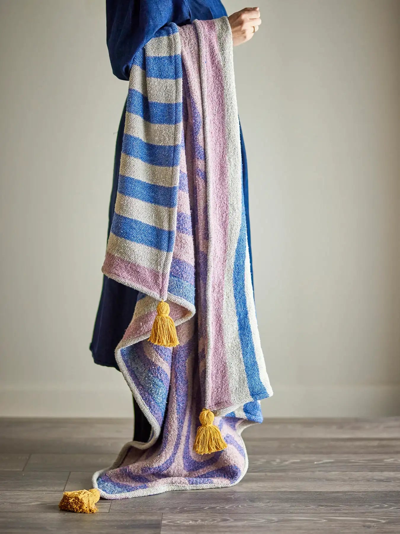 Detaljer & materiale: Arlie er vævet af genanvendt bomuld i blå og beige; bagsiden viser samme mønster i omvendte farver for en fin variation. Hjørnekvasterne i rosa og dyb gul giver en forfinet afslutning, der passer smukt til både lyse og mørke nuancer i hjemmet. Den faste, vævede struktur giver et pænt fald over sofa eller seng og føles smidig mod huden. Det bevidste materiale er et stilfuldt valg med blik for genbrug – uden at gå på kompromis med udtryk eller hygge.