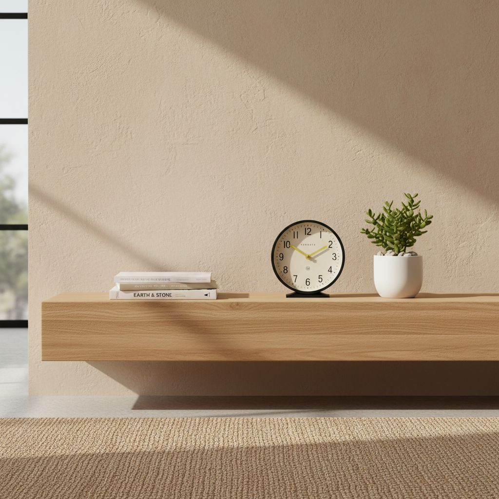 Dette kompakte ur (20 cm bredt) er udstyret med et støjsvagt kvartsurværk med lydløs visker. Det betyder: ingen tikkende lyd, men en blid, næsten lydløs bevægelse – ideelt til rum, hvor ro er vigtig, som soveværelset, hjemmekontoret eller læsehjørnet.