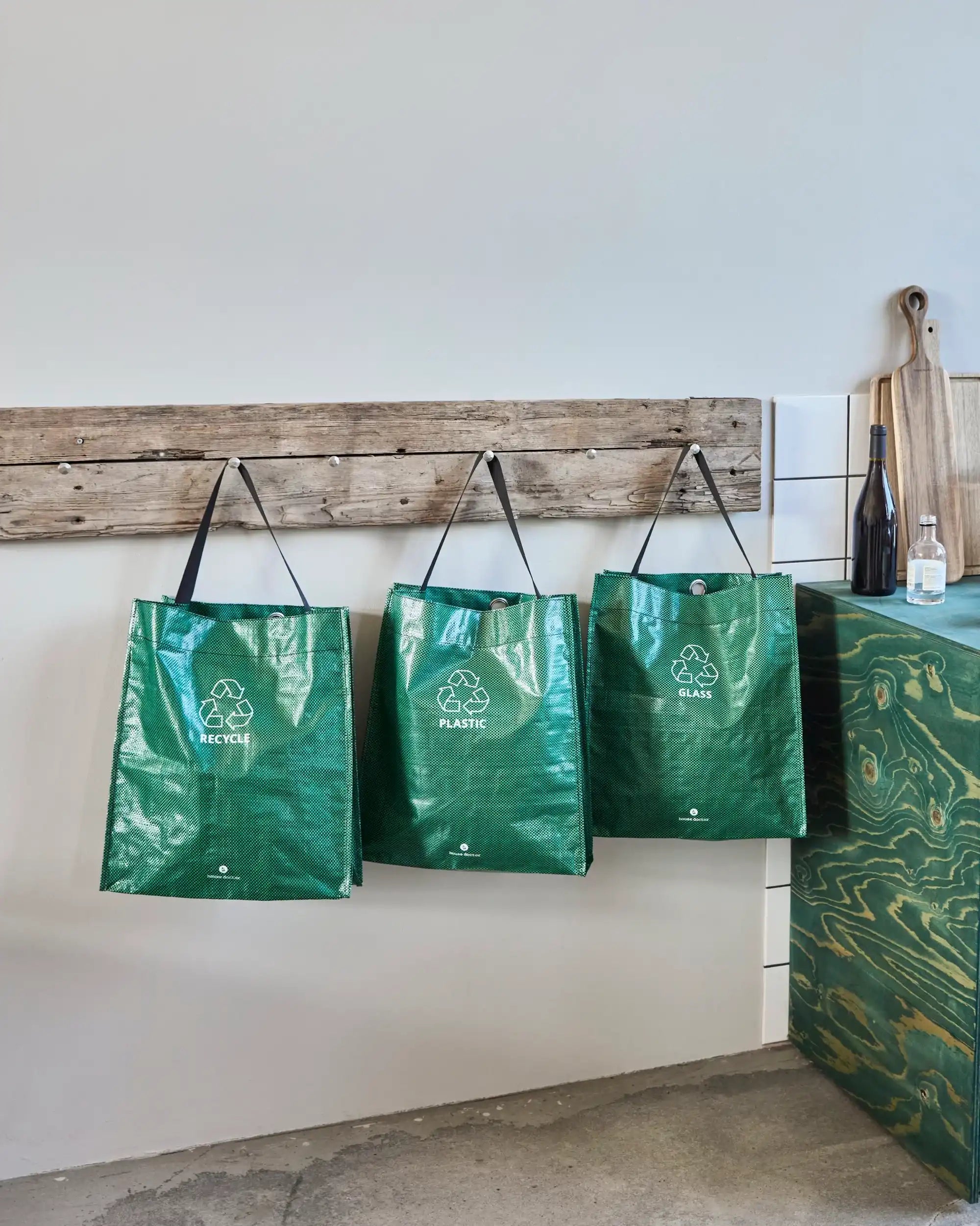 Et ryddeligt hjem starter med smarte løsninger. Dette grønne genbrugssæt gør det meget nemmere at sortere affald, uden at gå på kompromis med stilen. De tre ens tasker passer ubesværet ind i forskellige indretninger og skaber ro i en dagligdags opgave.