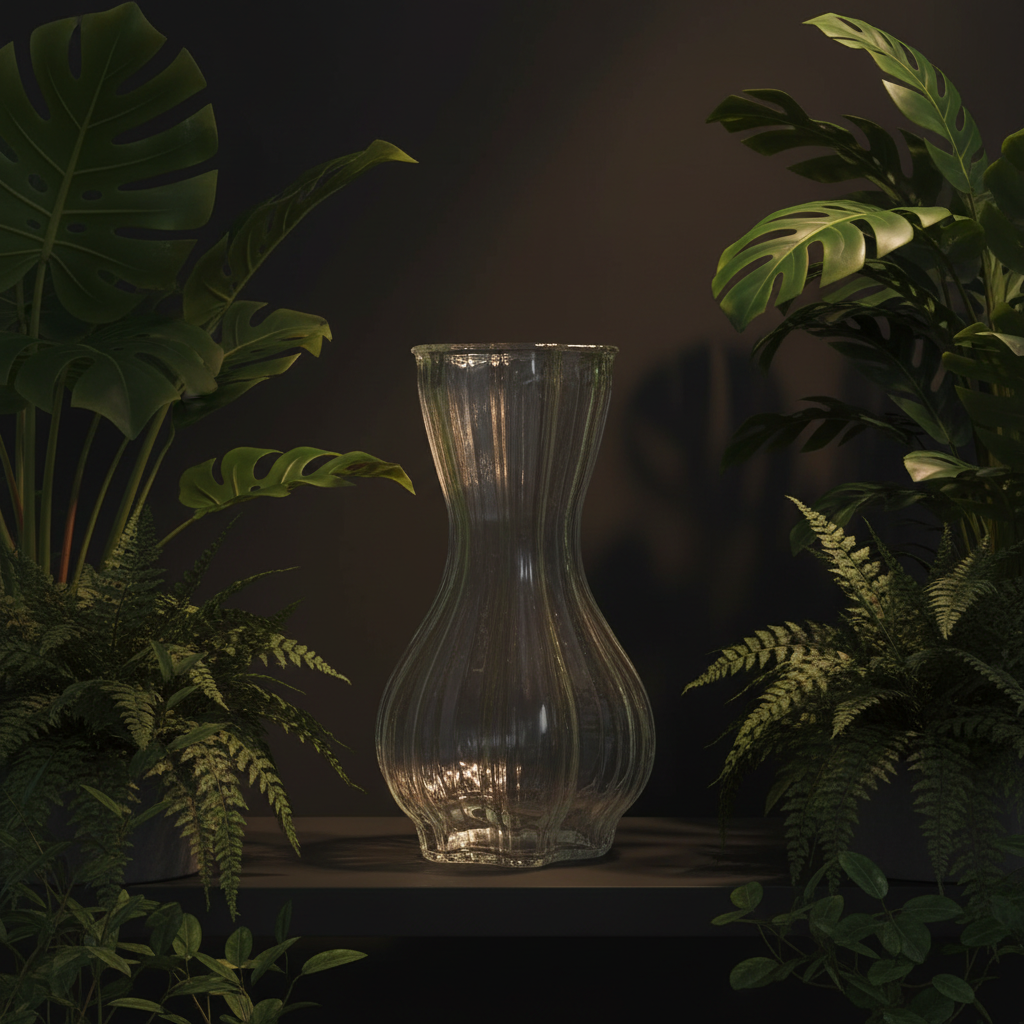 Vase Flin Fion klar er en stilfuld glasvase, der med sit transparente design passer ind i enhver indretning. Den elegante, bølgende form og den fine rillede struktur skaber et subtilt lysspil, hvilket giver vasen et roligt og luksuriøst udtryk. Det klare glas fremhæver blomster og grene smukt og gør enhver buket til et blikfang.