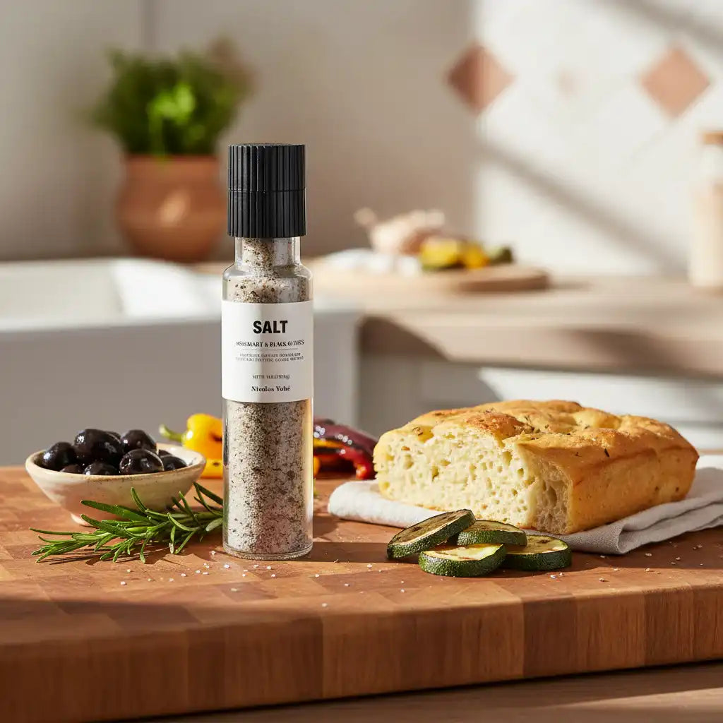 Derfor vil du gerne have dette havsalt fra Nicolas Vahé: Giv dit køkken et strejf af sydlandsk charme med dette særlige havsalt. Kombinationen af duftende rosmarin og fyldige, salte sorte oliven giver en dyb smag, der beriger dine retter — uden at tage overhånd. Håndværksmæssigt fremstillet i Europa for en ægte smagsoplevelse.