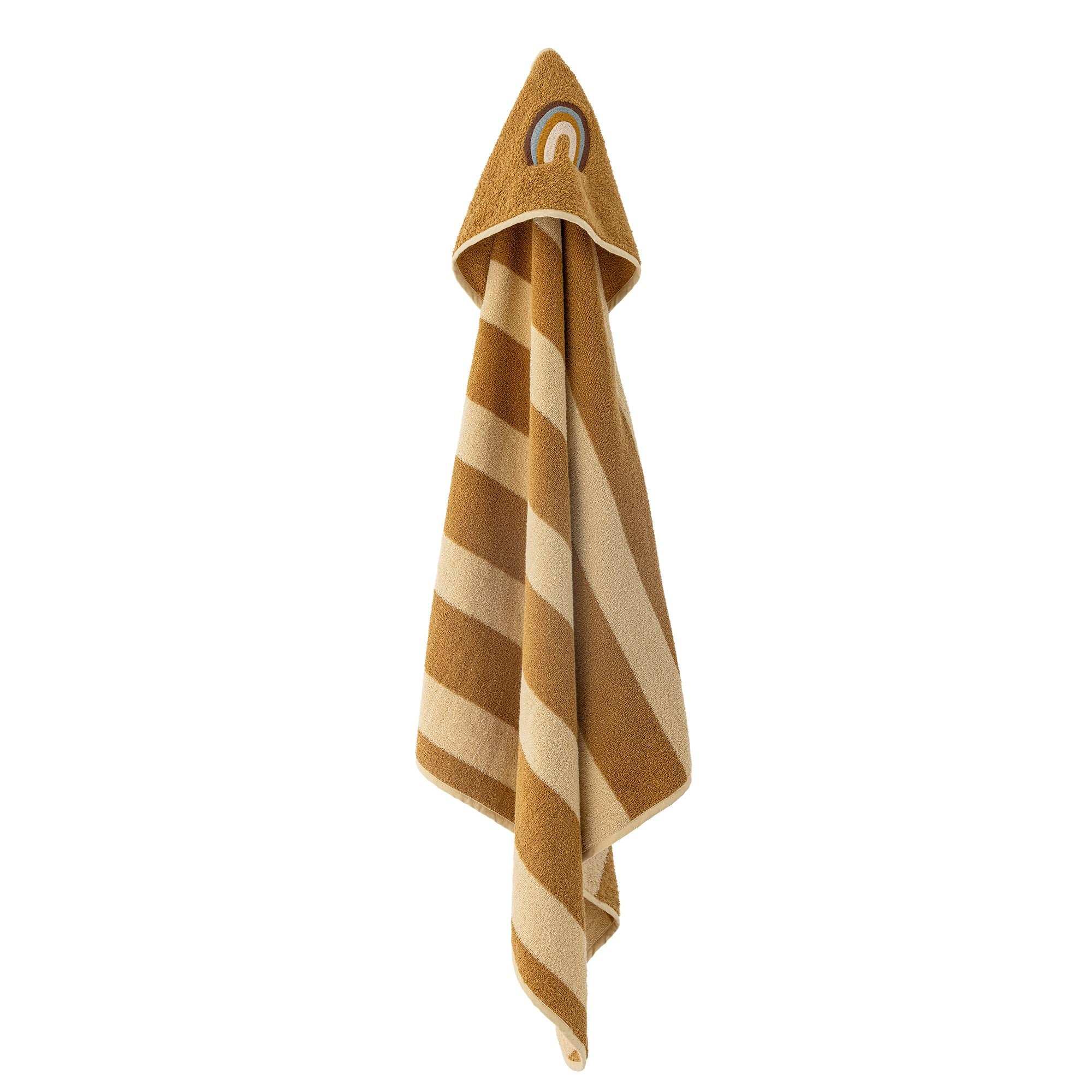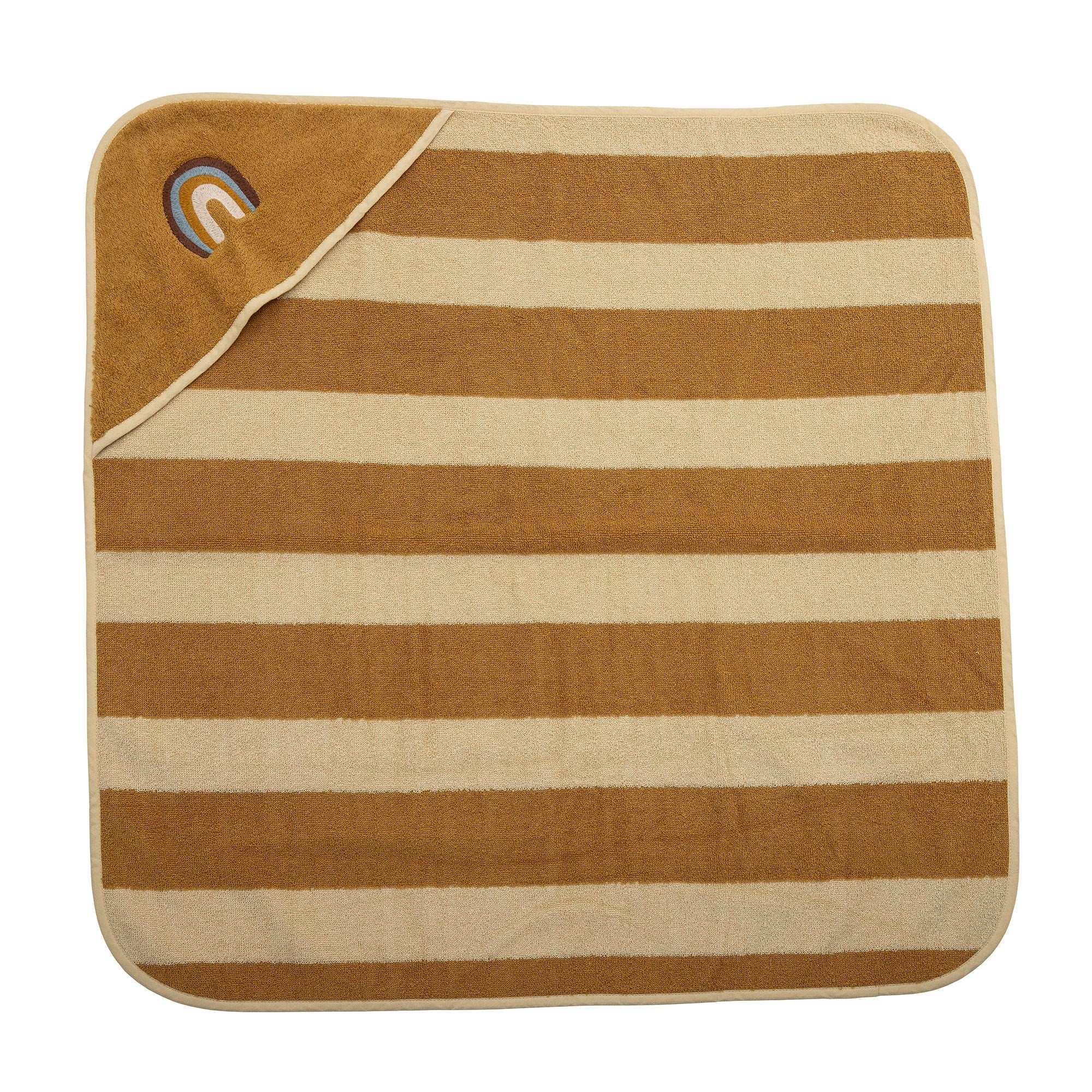 Details & Material: Das Badetuch besteht aus OEKO-TEX® Baumwolle. Das ist weich, sicher und eine gute Wahl für dein Kind. Die ruhige braune Farbe mit feinen Streifen passt in jedes Babyzimmer. Die Kapuze spendet extra Wärme und der gestickte Regenbogen macht das Design etwas verspielter. Praktisch für jeden Tag und auch noch hübsch anzusehen.