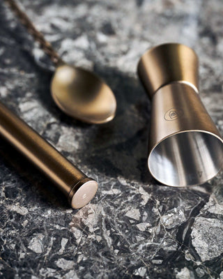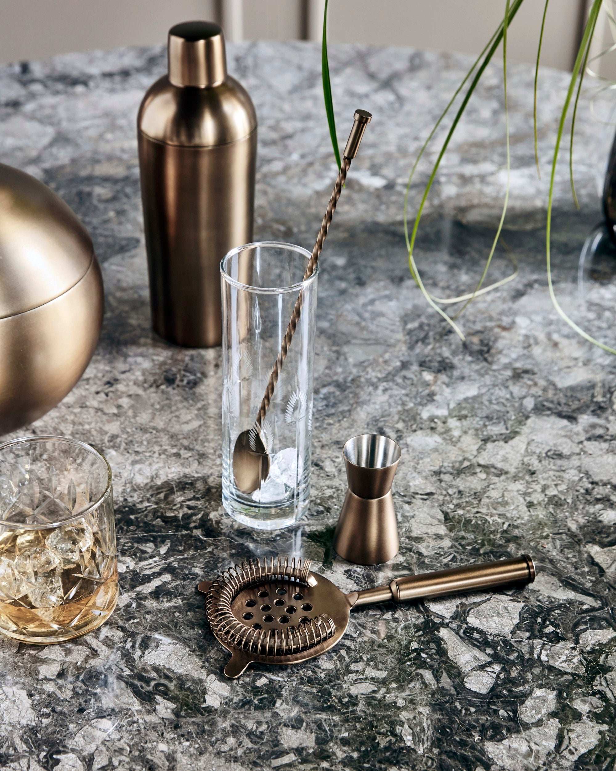 Veredle dein Cocktail-Erlebnis mit dem Baar Bar-Accessoires Set von House Doctor. Dieses stilvolle Set ist aus Edelstahl mit luxuriöser antik-messingfarbener Oberfläche gefertigt und verleiht eine elegante Vintage-Note, die sowohl in moderne als auch klassische Bars perfekt passt.