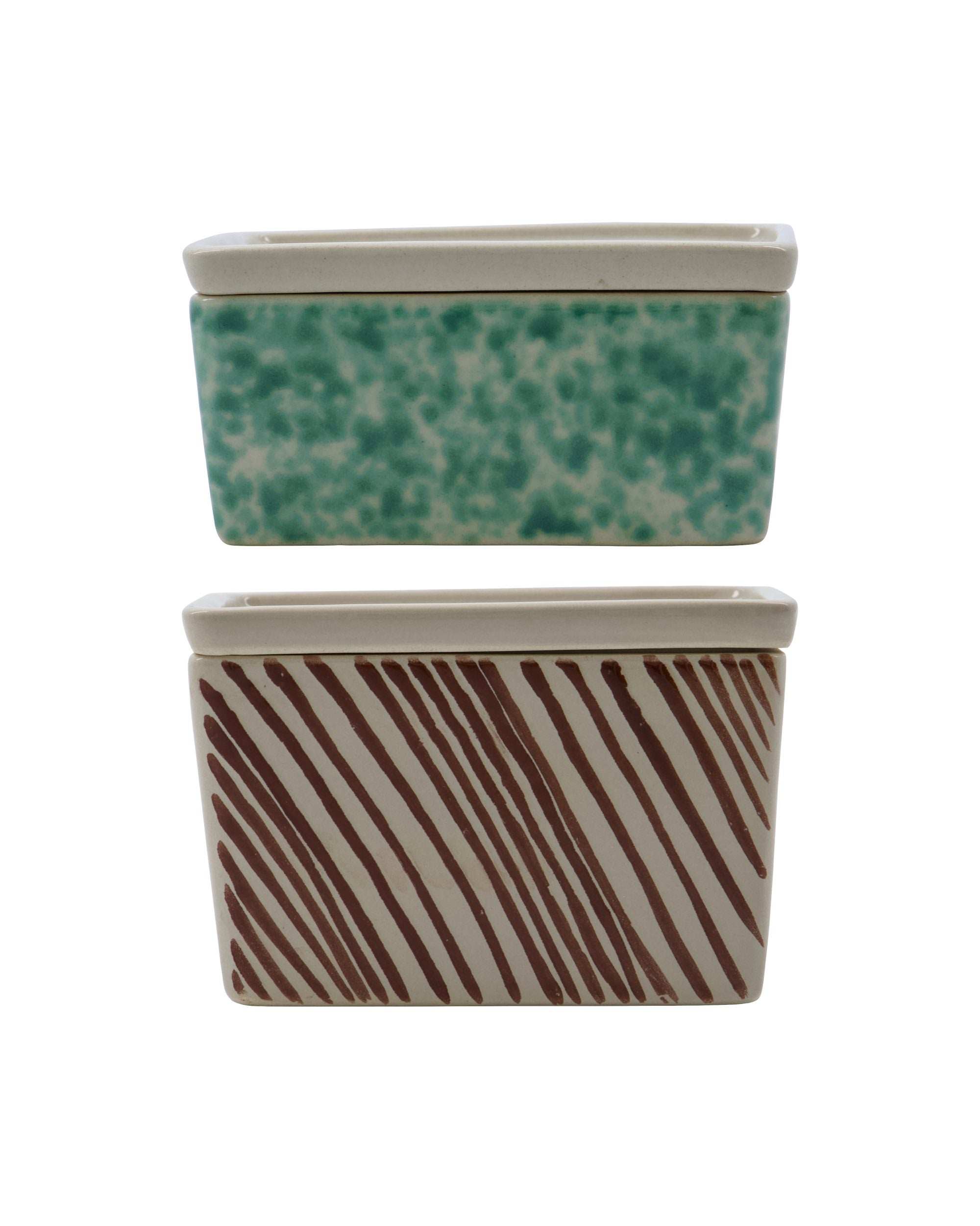 Die Dosen sind nicht nur dekorativ, sondern auch besonders praktisch: ideal zum Aufbewahren von Butter, Snacks, Resten oder kleinen Zutaten. Sie sind stapelbar, was in einer kompakten Küche besonders praktisch ist, und schließen dank des Keramikdeckels schön ab.