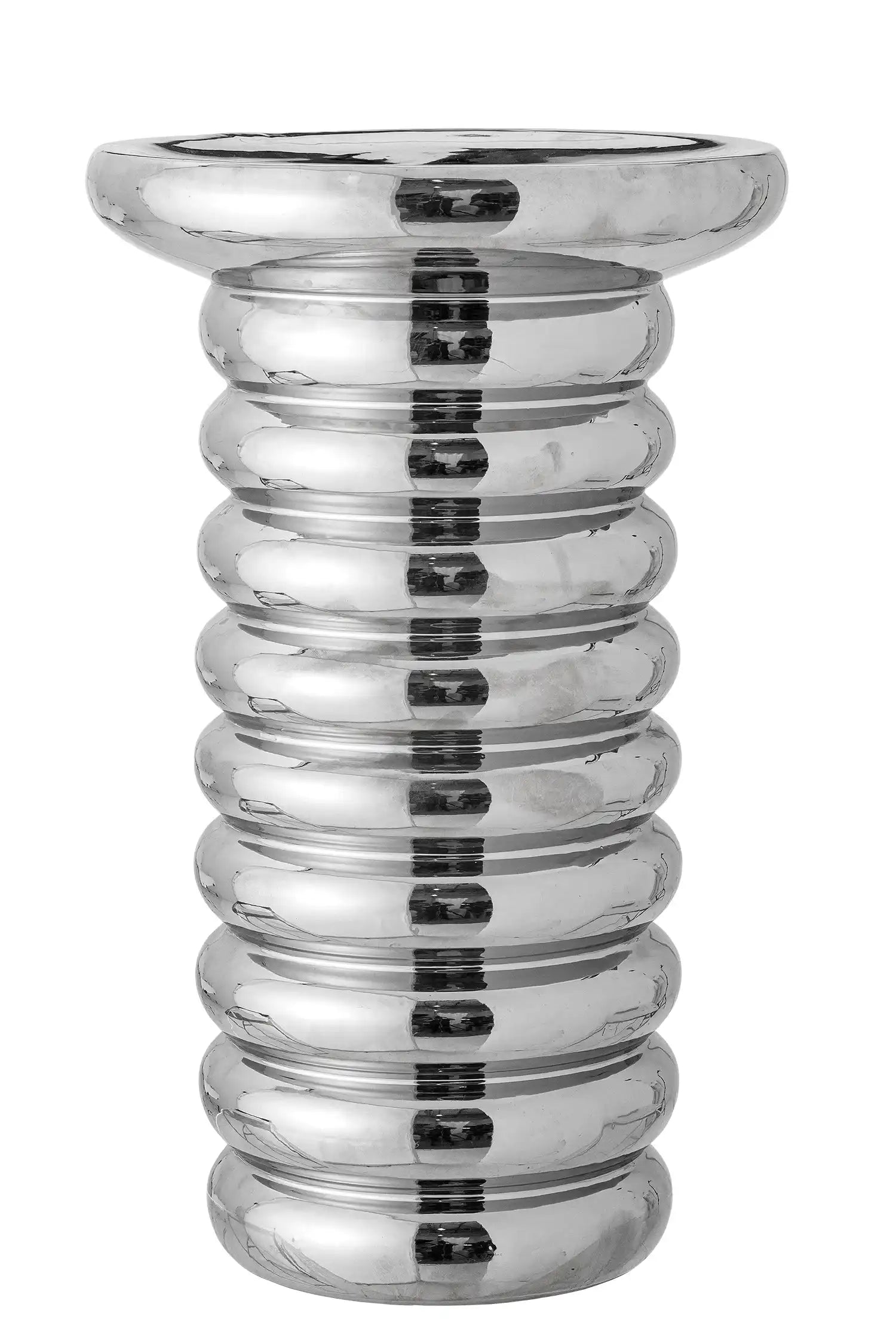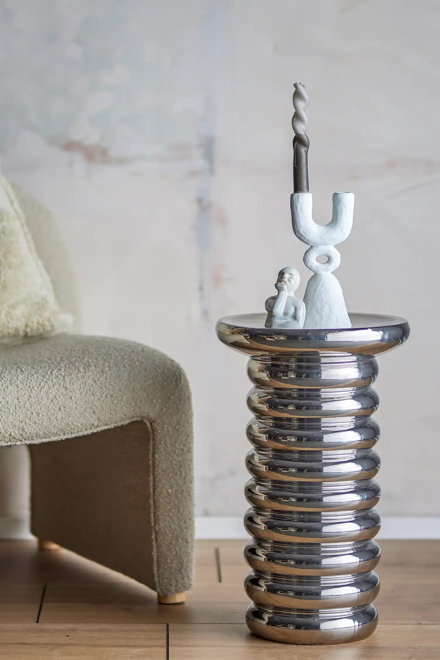 Details & Material: Dieser Tisch ist aus robustem Steingut gefertigt und mit einer spiegelnden Chromglasur versehen, die das Licht wunderschön reflektiert. Die zylindrische Form und das zeitlose Design passen mühelos zu modernen wie klassischen Wohnstilen, während das Format (Höhe 50 cm, Durchmesser 30 cm) vielseitige Einsatzmöglichkeiten bietet.