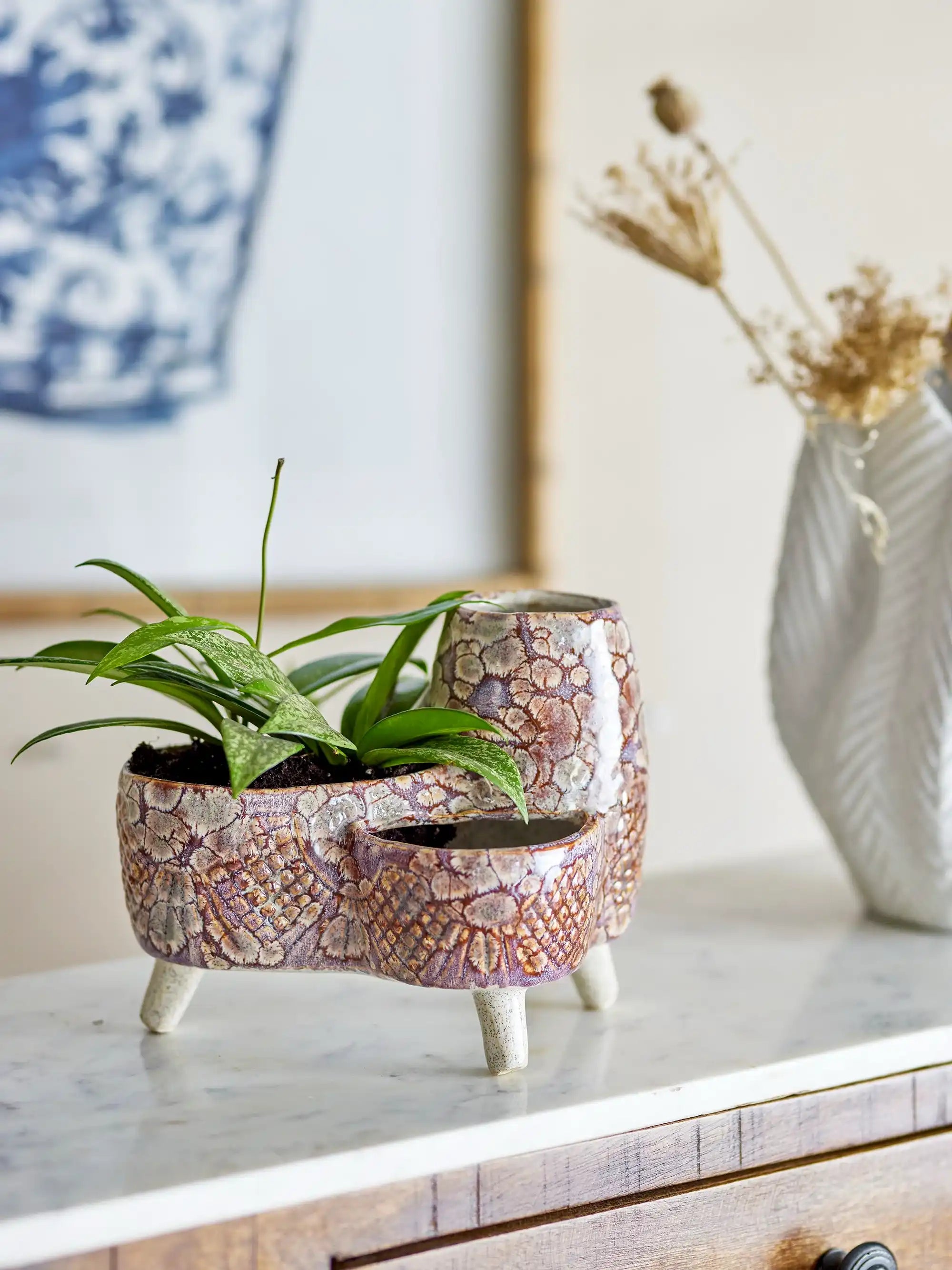 Details & Material: Der Shaya besteht aus hochwertiger Keramik in einem warmen Beige/Naturton. Die Maße b × h × t 15 × 17 × 21,5 cm machen ihn kompakt genug für kleinere Plätze, bieten aber dennoch ausreichend Platz für Kräuterpflanzen oder Küchenutensilien. Die Handarbeit und die reaktive Glasur sorgen für einen lebendigen, vielschichtigen Look; jedes Exemplar ist dadurch ein Unikat. Die drei Füße geben Stabilität und lassen die Oberfläche ordentlich wirken.