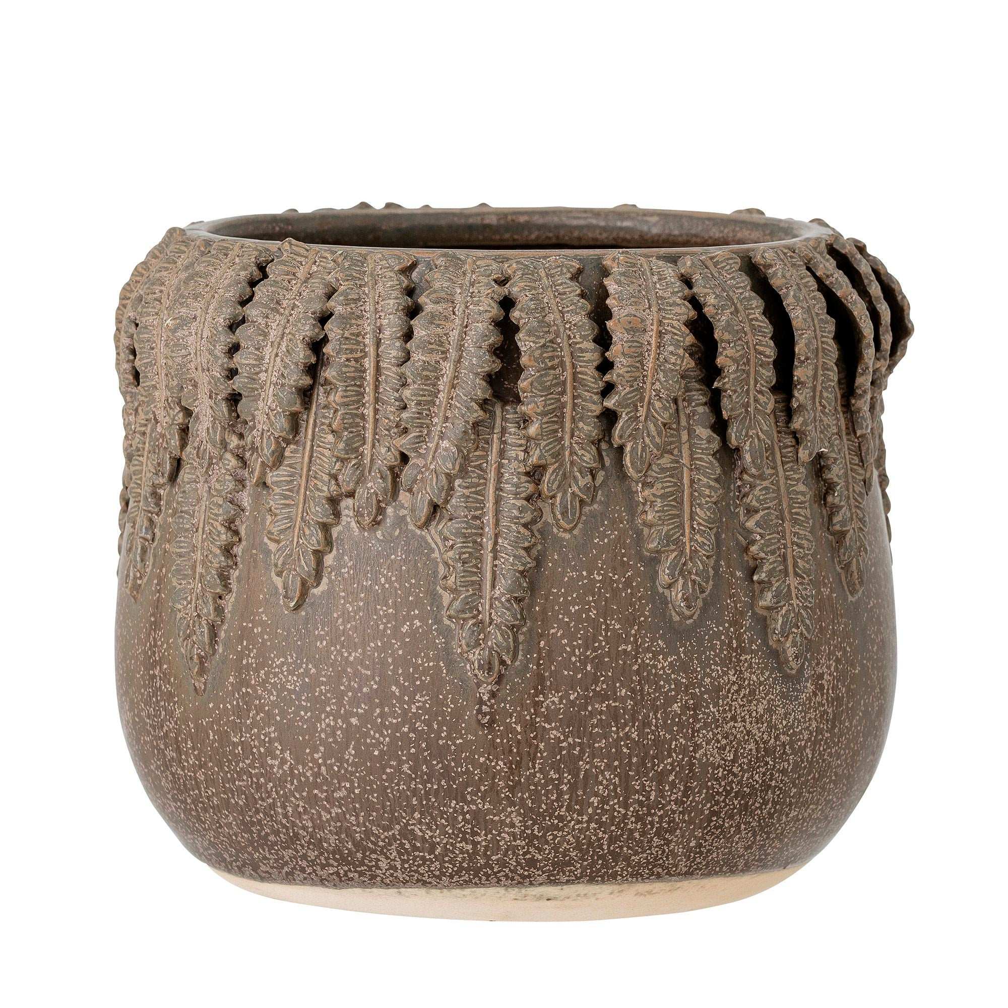 Details & Material: Der Topf besteht aus robustem Steingut und hat eine praktische Größe von ø 17 cm. Die braune Farbe wirkt edel und zeitlos, während das von Hand geschnitzte Blattmuster eine handwerkliche Ausstrahlung verleiht. Die solide Verarbeitung sorgt für einen stabilen Stand – genau das, was du suchst, damit deine Lieblingspflanze auf einer Kommode oder Fensterbank entspannt glänzen kann.