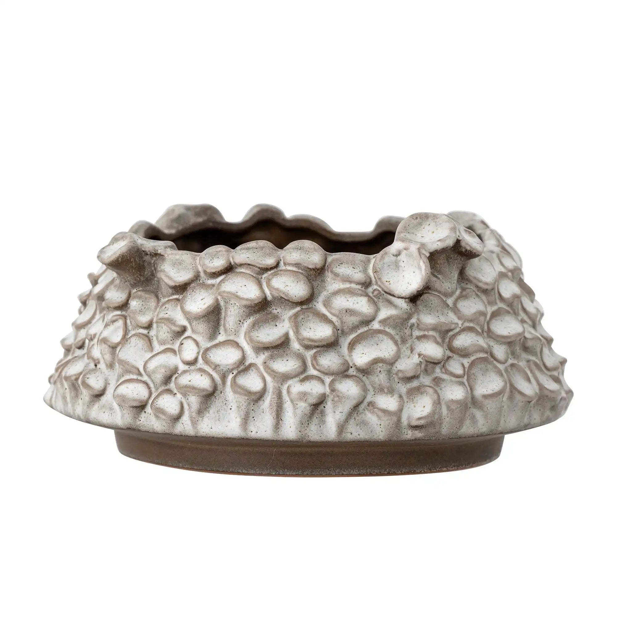 Details & Material: Der Topf ist aus Steingut gefertigt und von Hand geformt, was ihm eine solide Ausstrahlung mit sanften Rundungen verleiht. Die Innenseite ist glasiert für ein edles Finish und einen dezenten Glanz. Farbe: Grau. Maße: ø 23 cm, ideal für kompakte Zimmerpflanzen oder eine kleine Kräutermischung für drinnen. Der sanfte „Mushroom Look“ verleiht deinem Grün Höhe und Volumen, ohne zu dominieren.