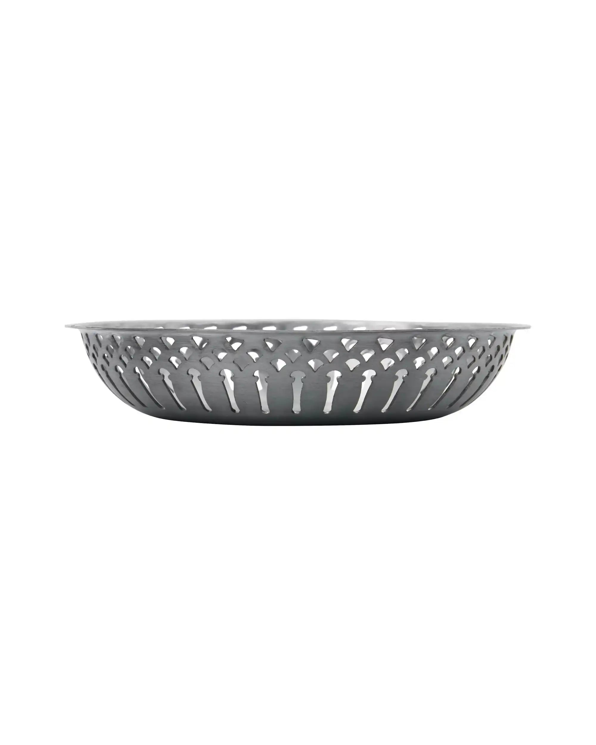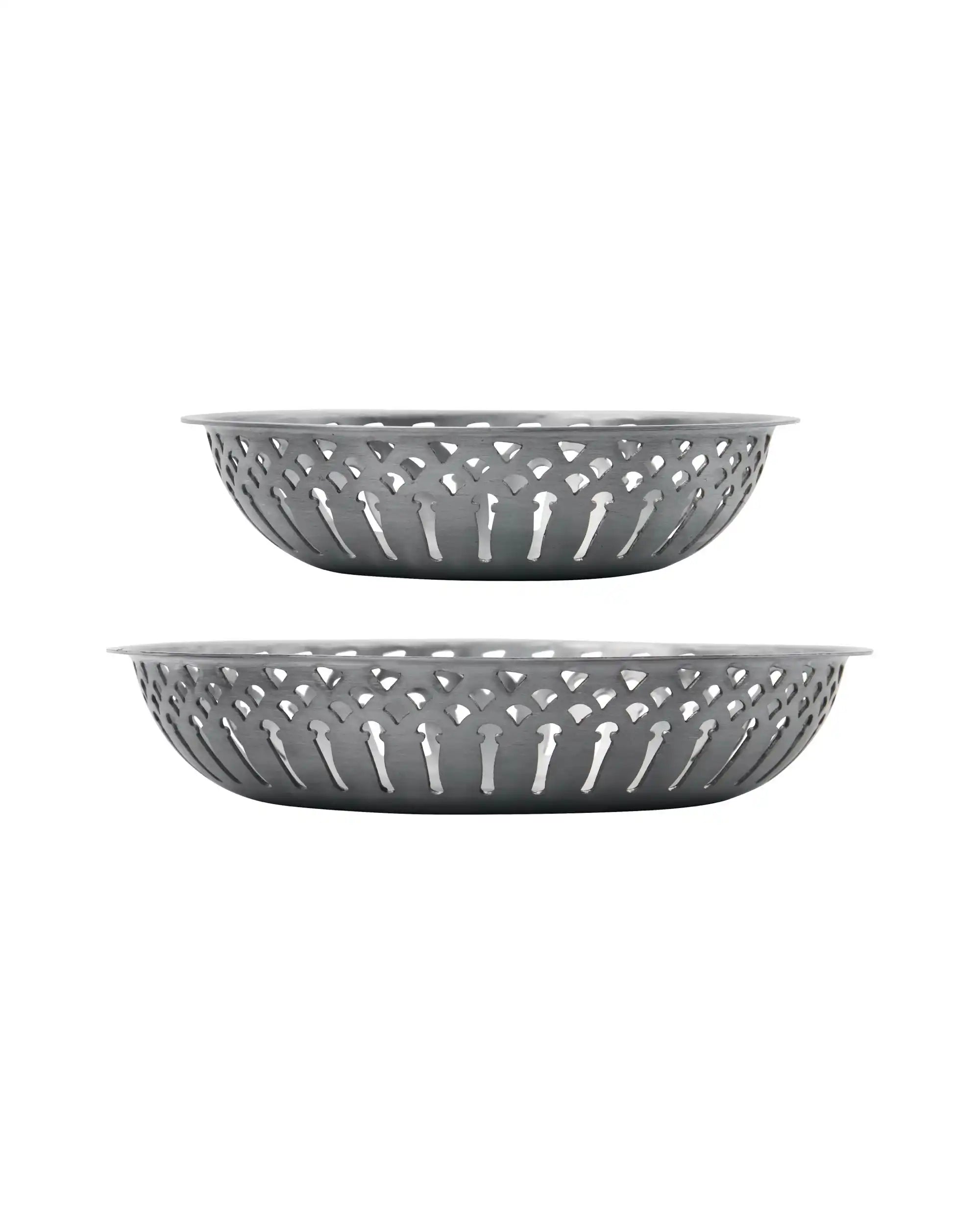 Verleihe deinem Tisch einen Hauch von Eleganz mit diesen stilvollen Brotkörben von Nicolas Vahé. Das Set aus zwei Körben besteht aus leichtem Aluminium und ist in dezent glänzendem Antiksilber gehalten. Durch das perforierte Randmuster bleiben Brötchen nicht nur knusprig, sondern sehen auf dem Tisch auch noch wunderschön aus.