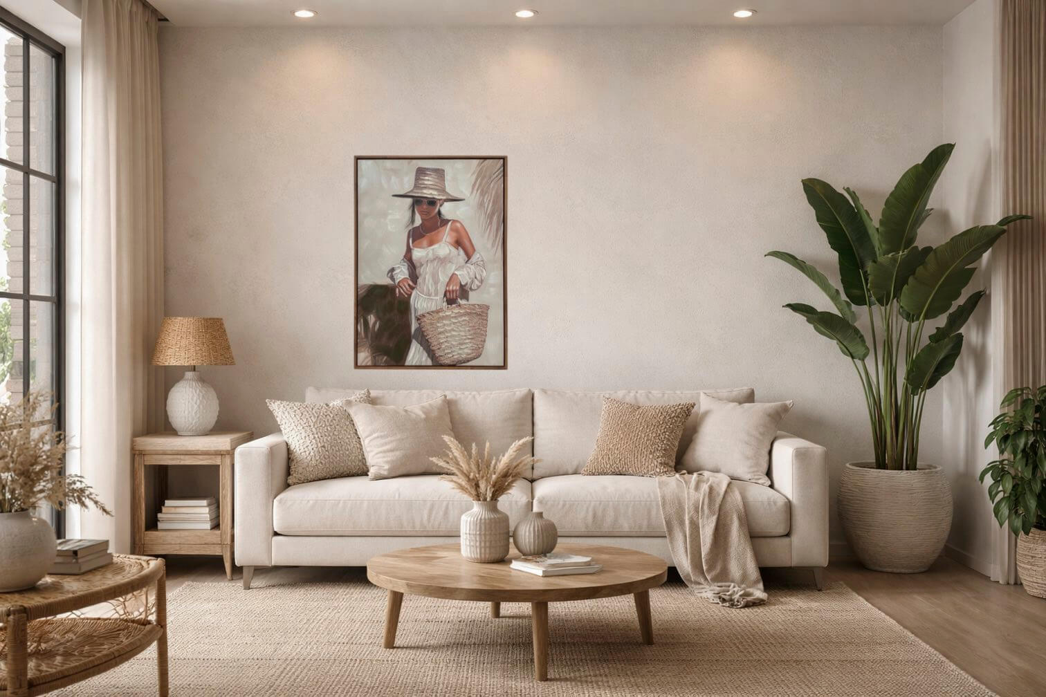Ein stilvolles und modernes Gemälde, das deinem Interieur eine warme, entspannte Atmosphäre verleiht. Dieses Canvas-Bild zeigt eine Frau mit großem Hut und Sonnenbrille, gekleidet in helle, sommerliche Nuancen. Die Kombination aus sanften Farben, natürlichen Elementen und feinen Pinselstrichen schafft ein elegantes Kunstwerk mit ruhiger Ausstrahlung.