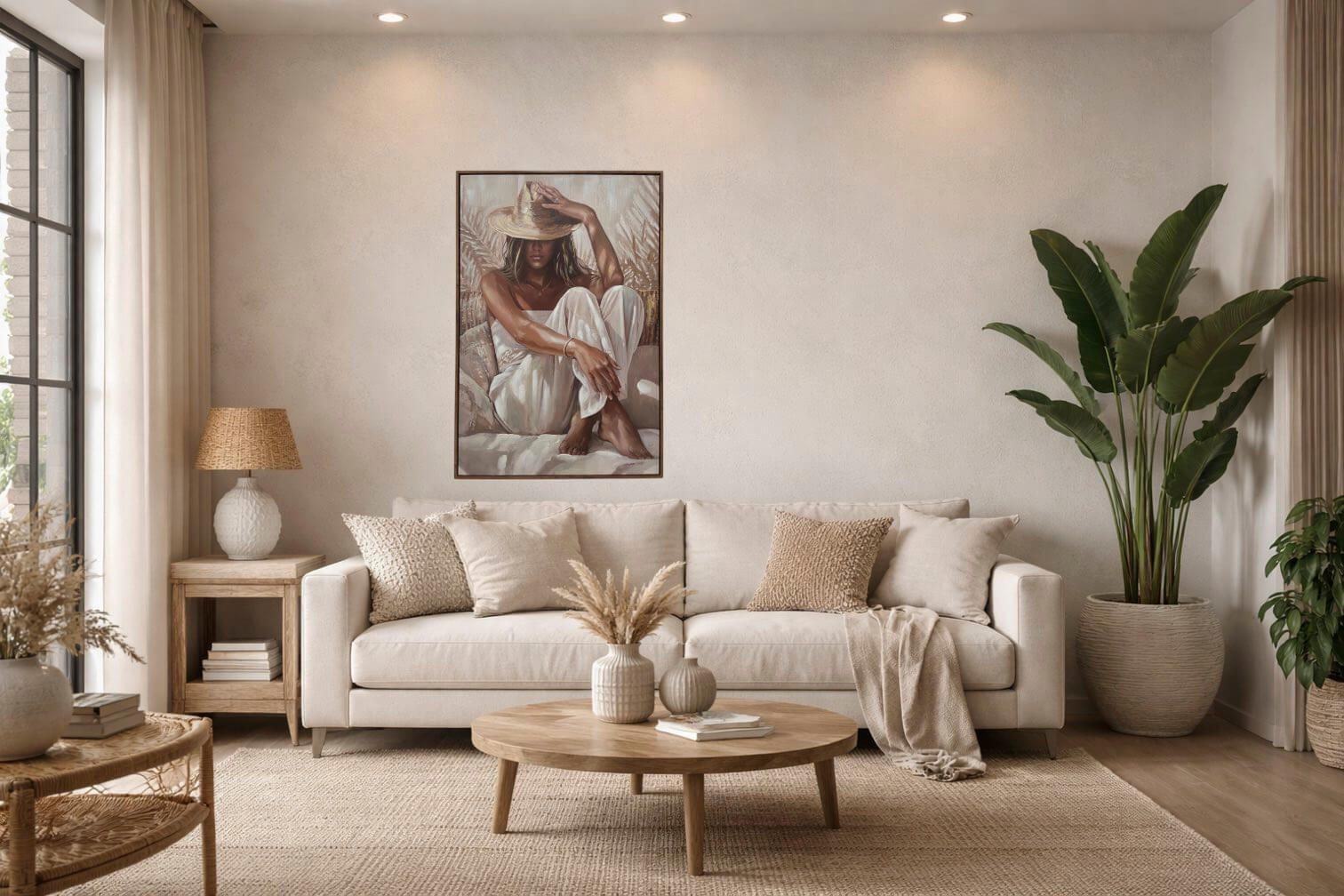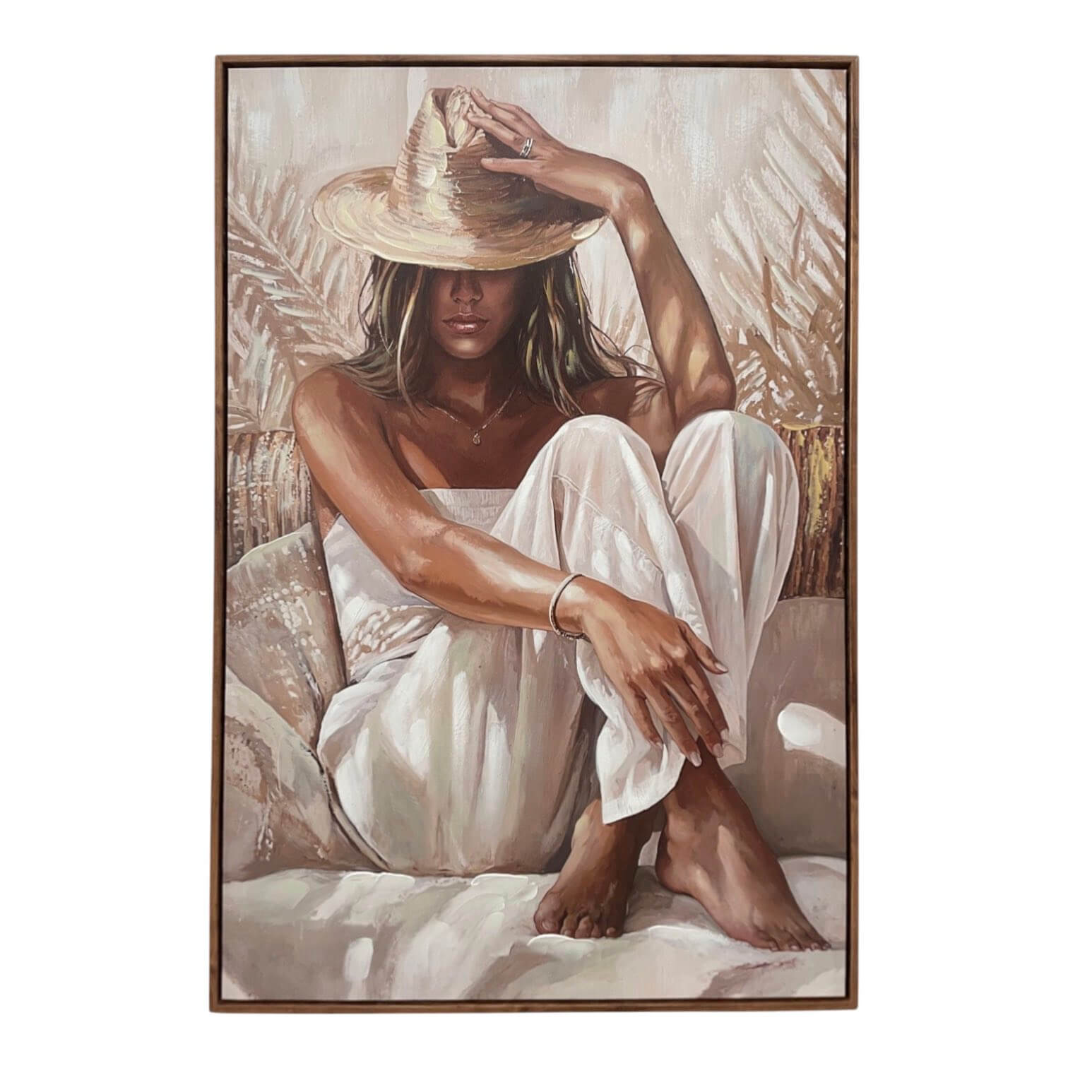 Ein elegantes und stimmungsvolles Bild, das Ruhe und Wärme in dein Zuhause bringt. Dieses Leinwandbild zeigt eine Frau mit einem großen Hut, in entspannter Haltung, umgeben von sanften Naturtönen. Die Kombination aus warmen Farben, feinen Pinselstrichen und natürlichen Elementen schafft ein Kunstwerk mit ruhiger und stilvoller Ausstrahlung.