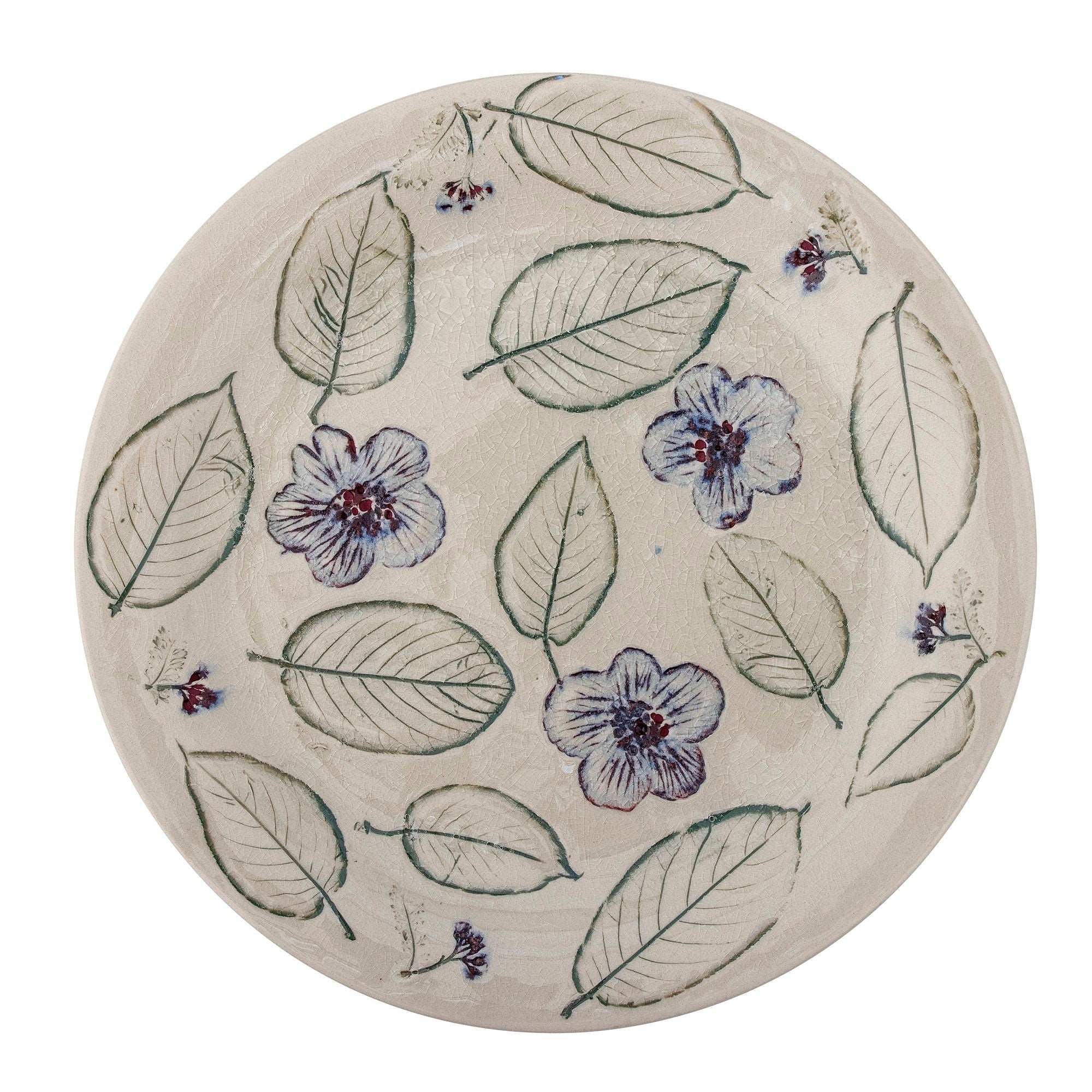 Details & Material: Gefertigt aus Steingut in frischem Grün, mit wunderschönem Relief und handbemalten Details in Blau. Die Größe ø 28 cm bietet viel Platz, ohne wuchtig zu wirken: ideal für kleine Snacks, Tee- und Kaffeemomente oder eine Komposition mit Kerzen und Accessoires. Der botanische Print mit Blättern und Blumen verleiht Tiefe und Struktur, sodass das Tablett auch ohne Inhalt ein schönes Objekt ist. So holst du dir ein Stück nach Hause, das sowohl dekorativ als auch praktisch ist.