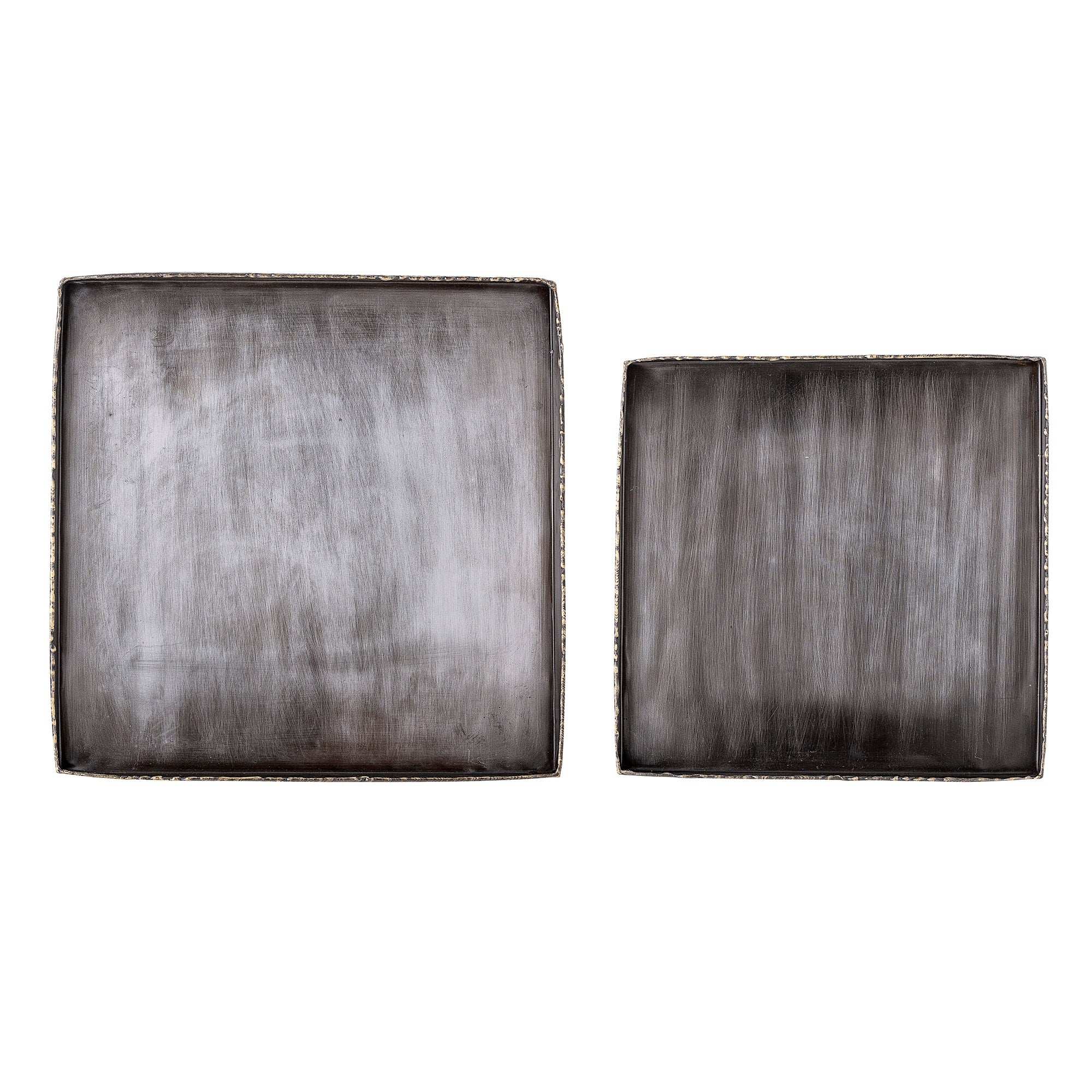 Das Set besteht aus zwei quadratischen Tabletts, gefertigt aus robustem Metall: