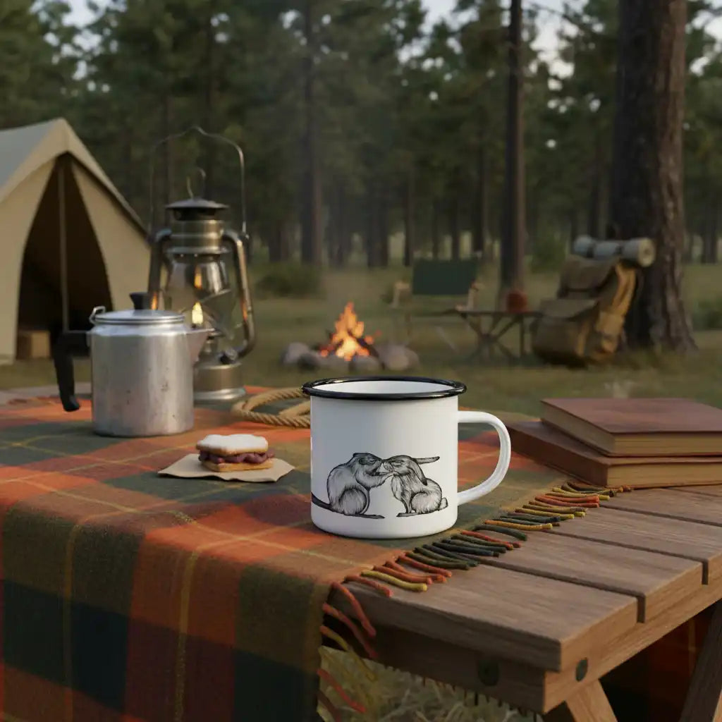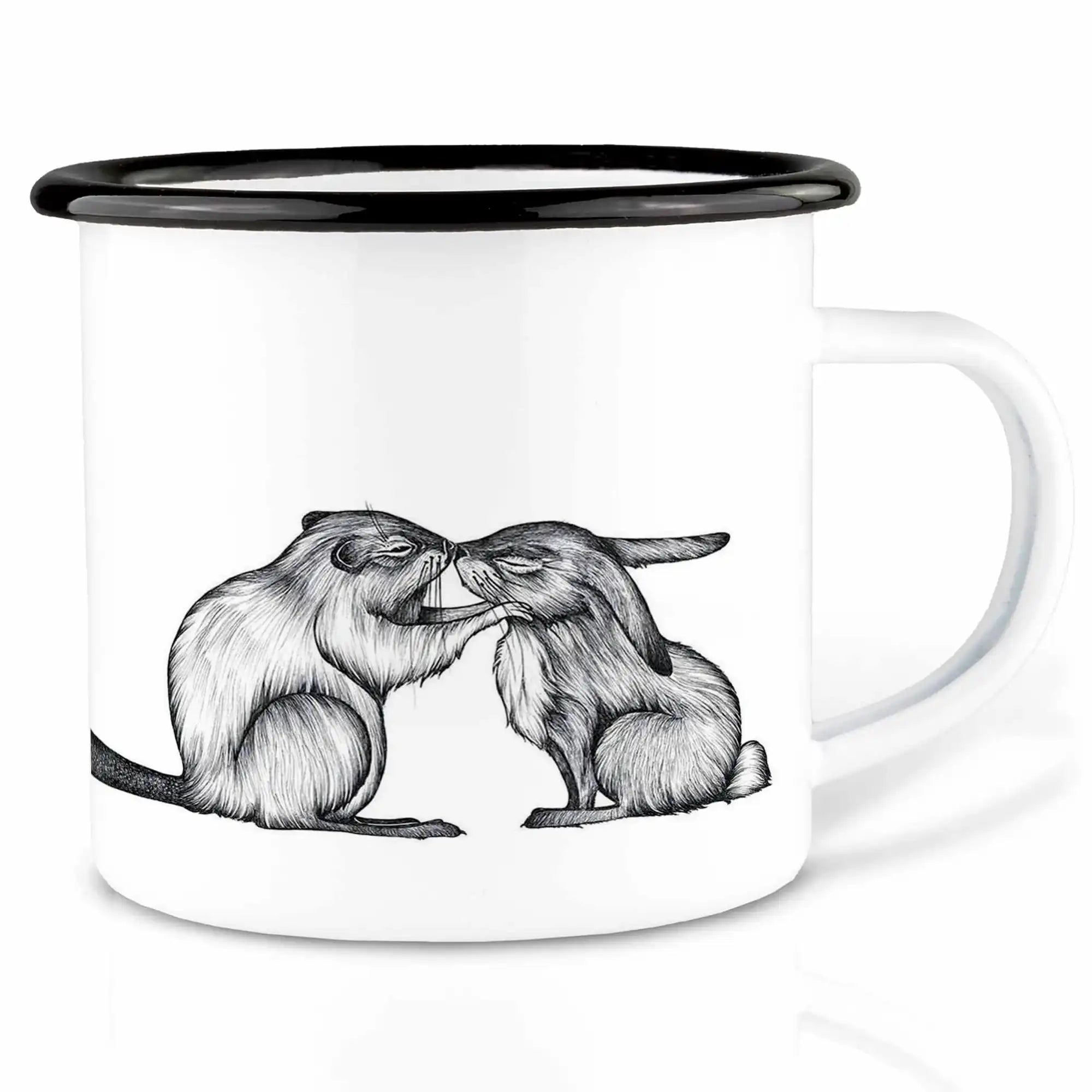 Ein stiller und zarter Moment, eingefangen in einer Illustration. Diese Emaille-Tasse mit Biber und Kaninchen zeigt eine feine Schwarz-Weiß-Zeichnung, in der sich zwei Tiere behutsam begegnen. Ein ruhiges Design, das dazu einlädt, beim Kaffee- oder Teegenuss einen Moment innezuhalten.