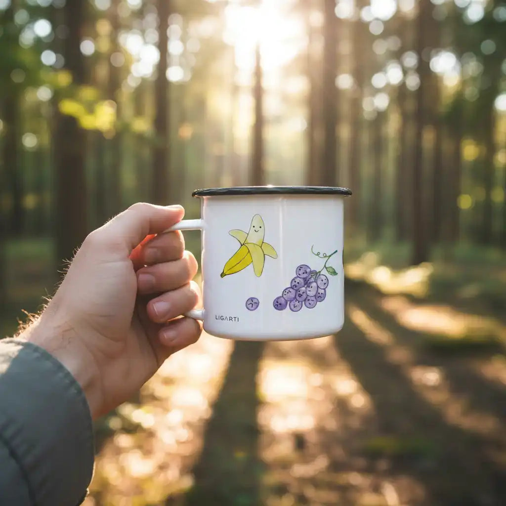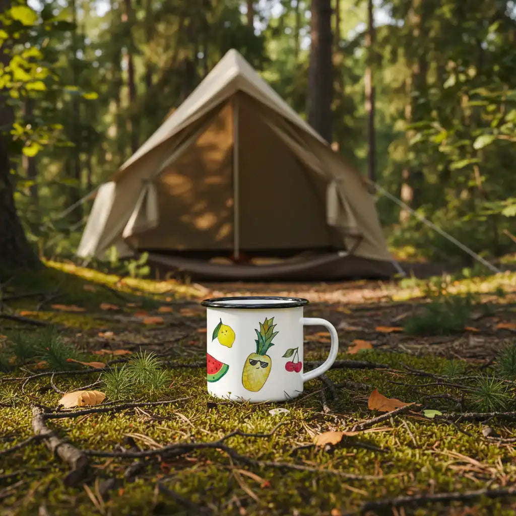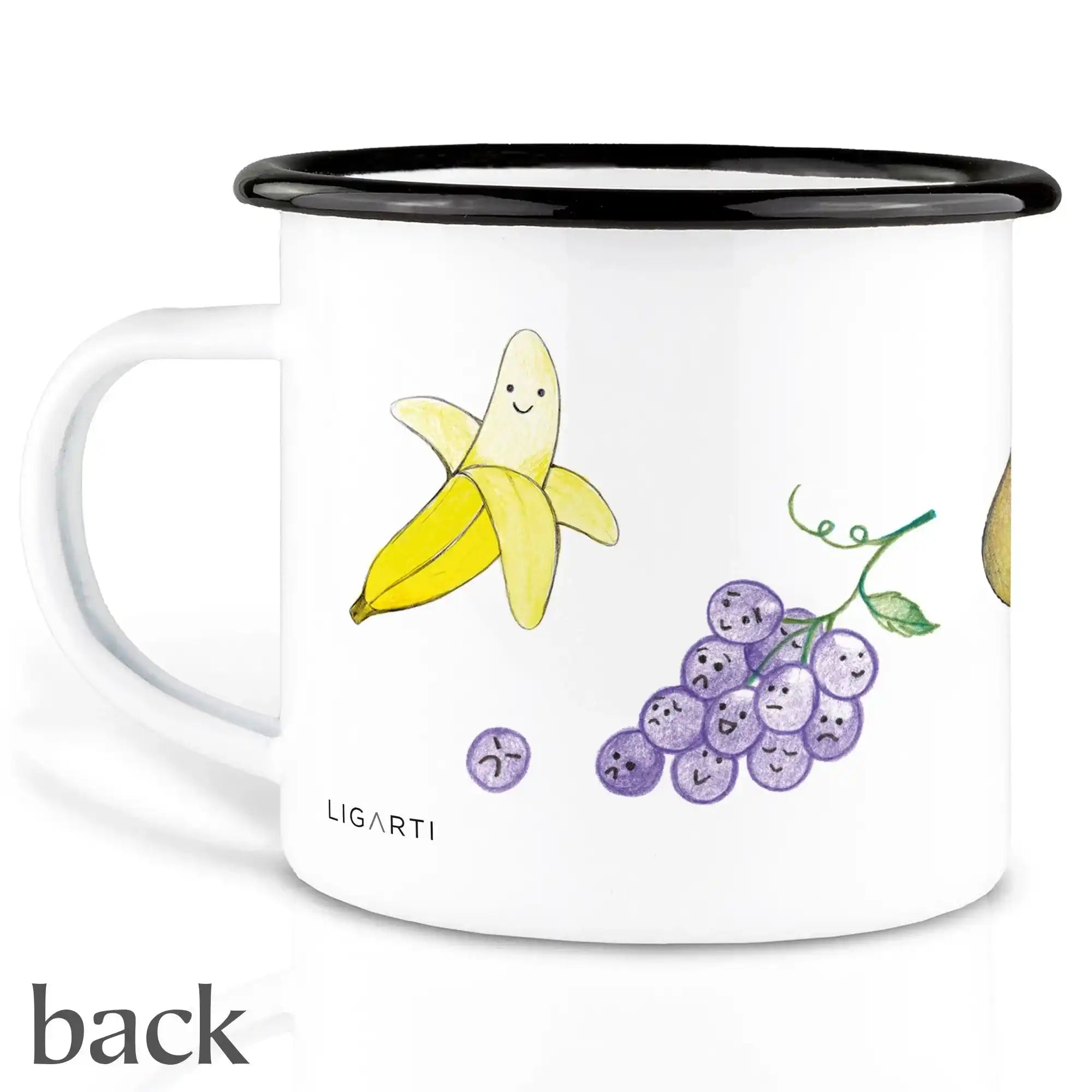 Bringe Farbe und Fröhlichkeit auf den Tisch mit dieser Emaille-Tasse mit Fruchtmotiven. Die Tasse ist voller verspielter Figuren – von einer entspannten Banane bis zu einer sommerlichen Ananas mit Sonnenbrille. Ideal für Kaffee, Tee oder einen erfrischenden Fruchtsaft und garantiert ein Lächeln bei jedem Schluck.