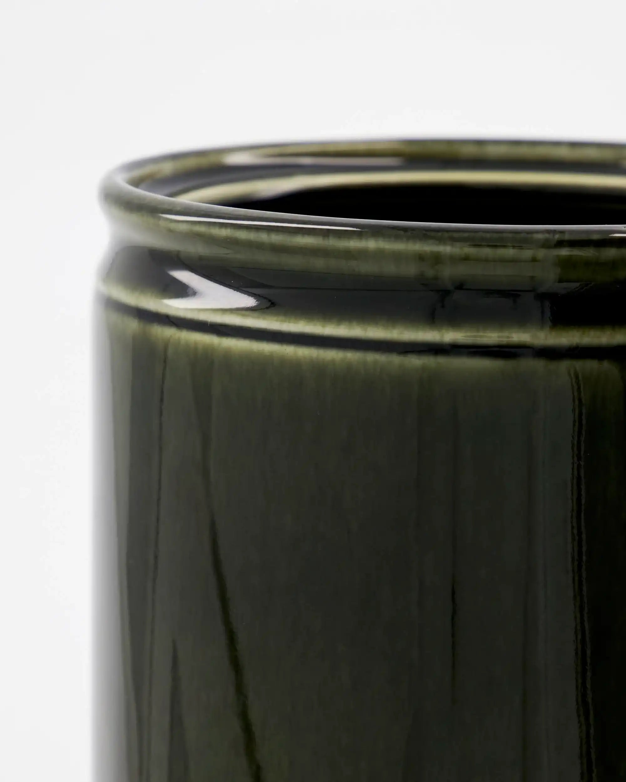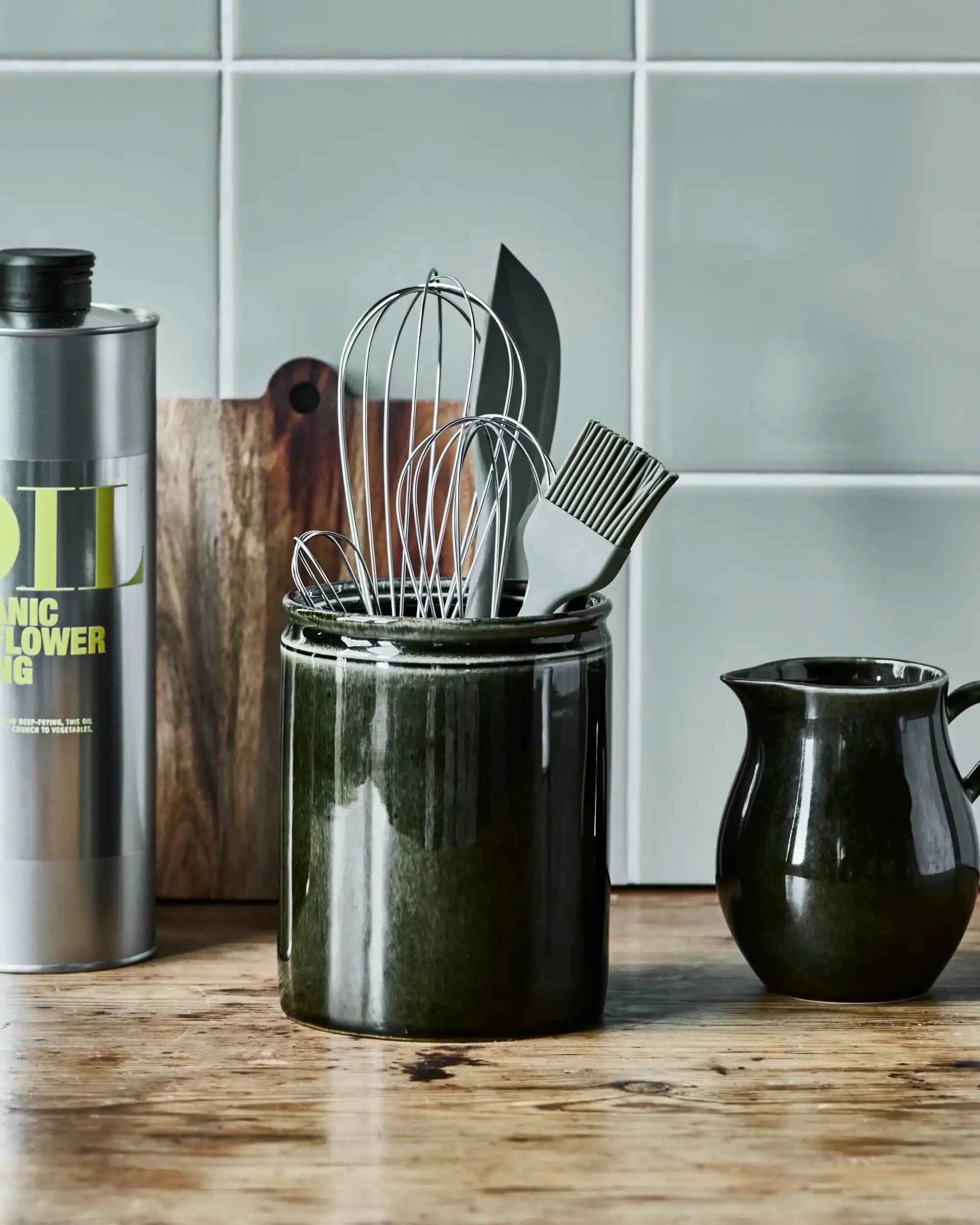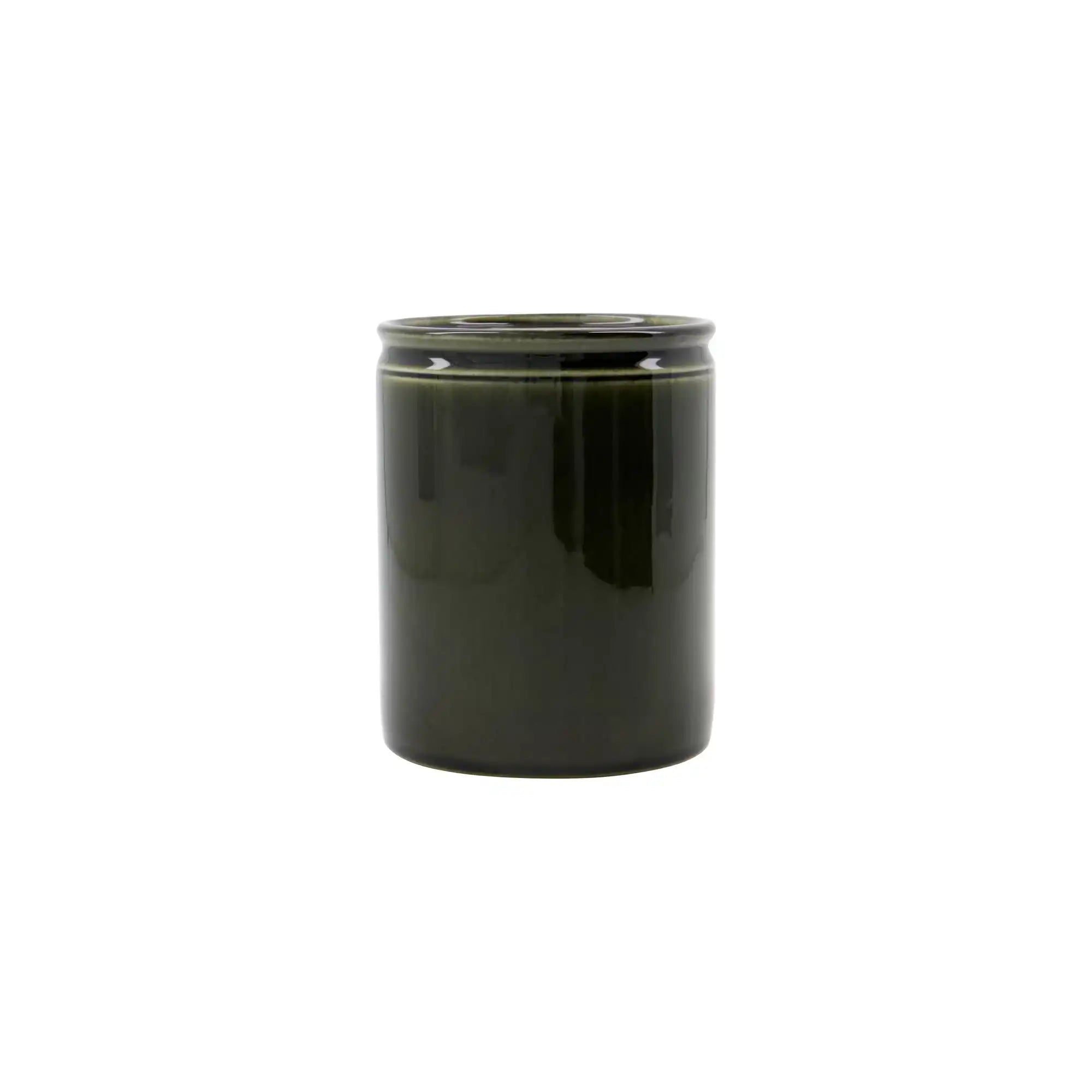 Dieser Topf besteht aus robustem Steingut und ist mit einer glänzend grünen Beschichtung versehen. Dank der zylindrischen Form und einer Höhe von 14 cm bietet er ausreichend Platz für Pfannenwender, Schneebesen oder Holzlöffel. Mit einem Durchmesser von 11 cm nimmt er dennoch wenig Platz auf der Arbeitsfläche ein.