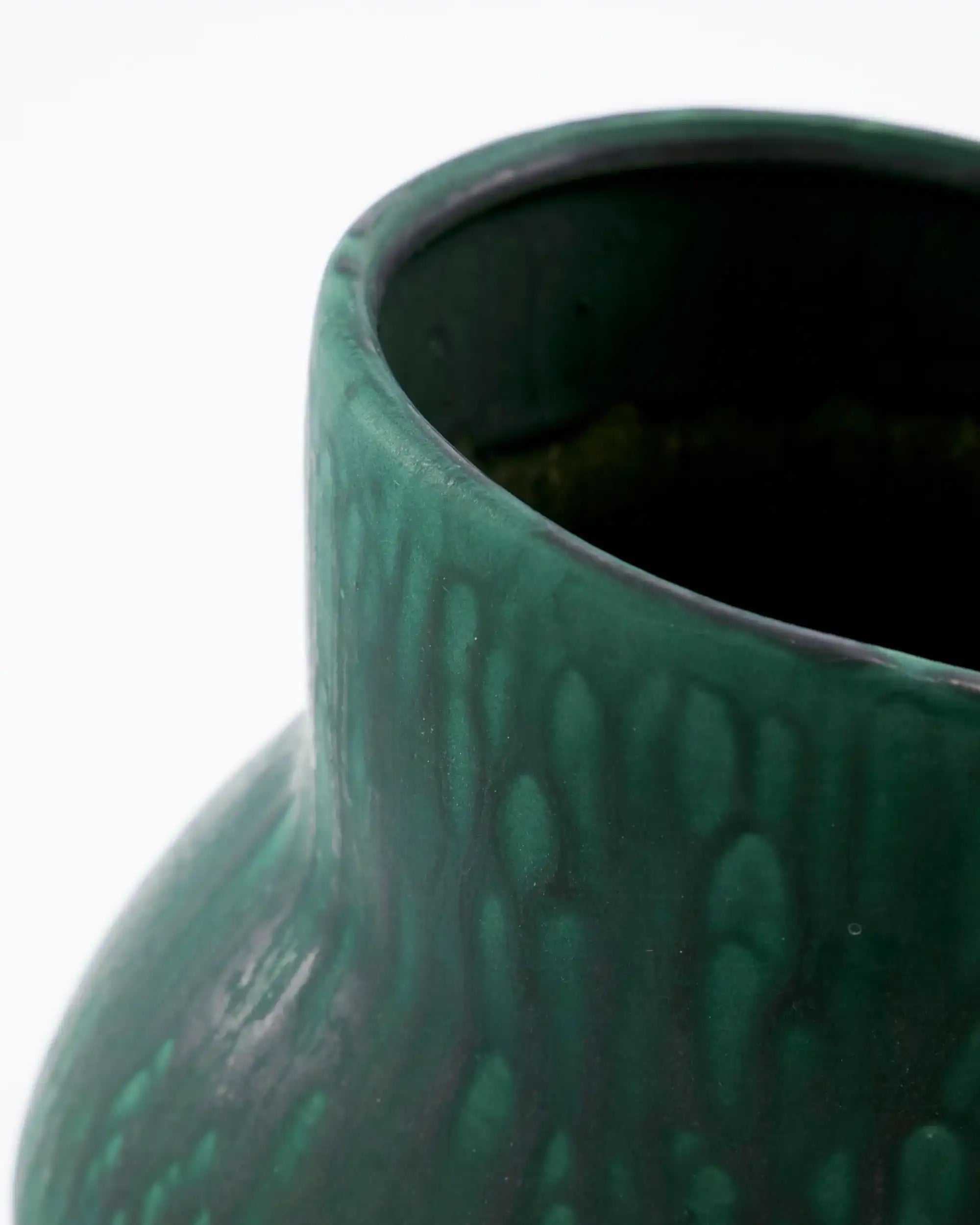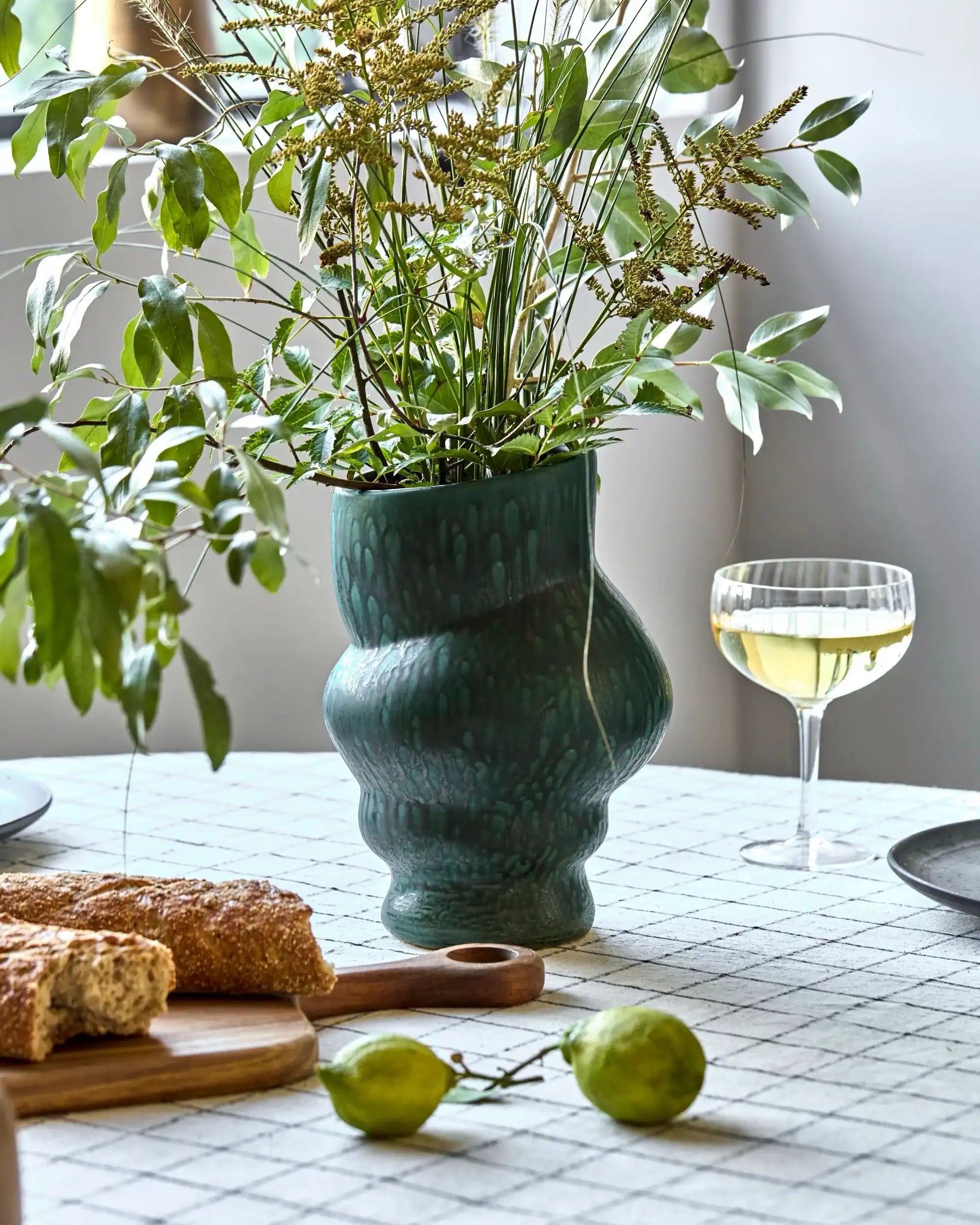 Diese Vase wurde mit Sorgfalt aus Keramik gefertigt und hat ein glänzendes grünes Finish. Die organische Form mit runden Linien wirkt natürlich und lädt zum Kombinieren ein. Mit einer Höhe von 25 cm und einem Durchmesser von 17 cm ist sie ideal für einen einzelnen Zweig, ein paar Blumen oder einfach als dekoratives Objekt.