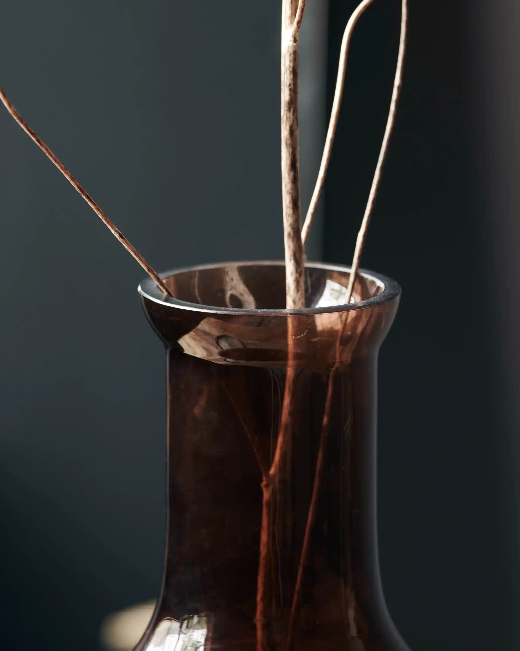 Gefertigt aus robustem Glas und mit einer dezenten braunen Beschichtung auf der Außenseite versehen, strahlt diese Vase eine ruhige Eleganz aus. Mit einer Höhe von 51 cm und einem Durchmesser von 28 cm ist sie perfekt, um allein zu stehen oder als Teil einer stilvollen Vasengruppe. Das Glas glänzt wunderschön und fängt das Licht auf spielerische Weise ein.