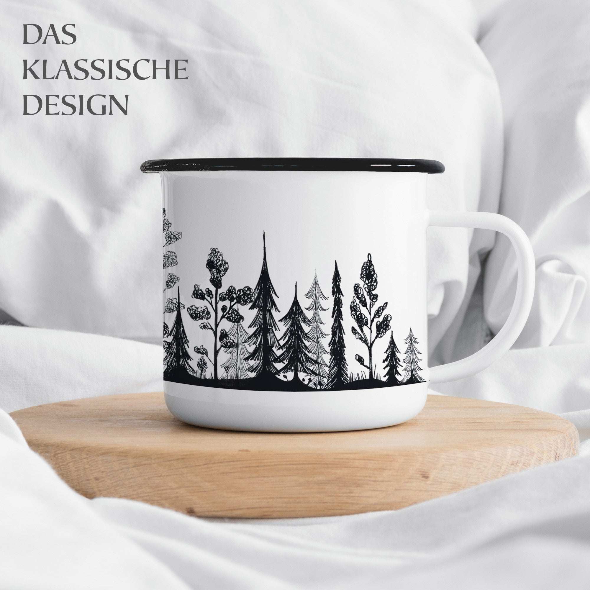 Diese Emaille-Tasse ist handgefertigt und handbedruckt in Deutschland. Das schlichte schwarze Waldmotiv kommt auf dem weißen Metall mit klassischem schwarzen Rand besonders schön zur Geltung. Mit einem Fassungsvermögen von 300 ml ist sie ideal für deinen täglichen Kaffee- oder Teemoment – drinnen oder draußen.