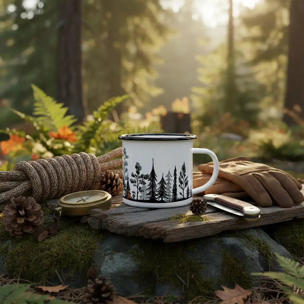 Die Ligarti Handgemachte Emaille Tasse Wald 300ml ist eine Hommage an Schlichtheit und Natur. Auf der Tasse sind stilisierte schwarze Bäume, klar und minimalistisch gezeichnet, die zusammen einen ruhigen Wald bilden. Ein kraftvolles Design, das Gelassenheit ausstrahlt – perfekt für alle, die Stille, Spaziergänge und eine gute Tasse Kaffee lieben.