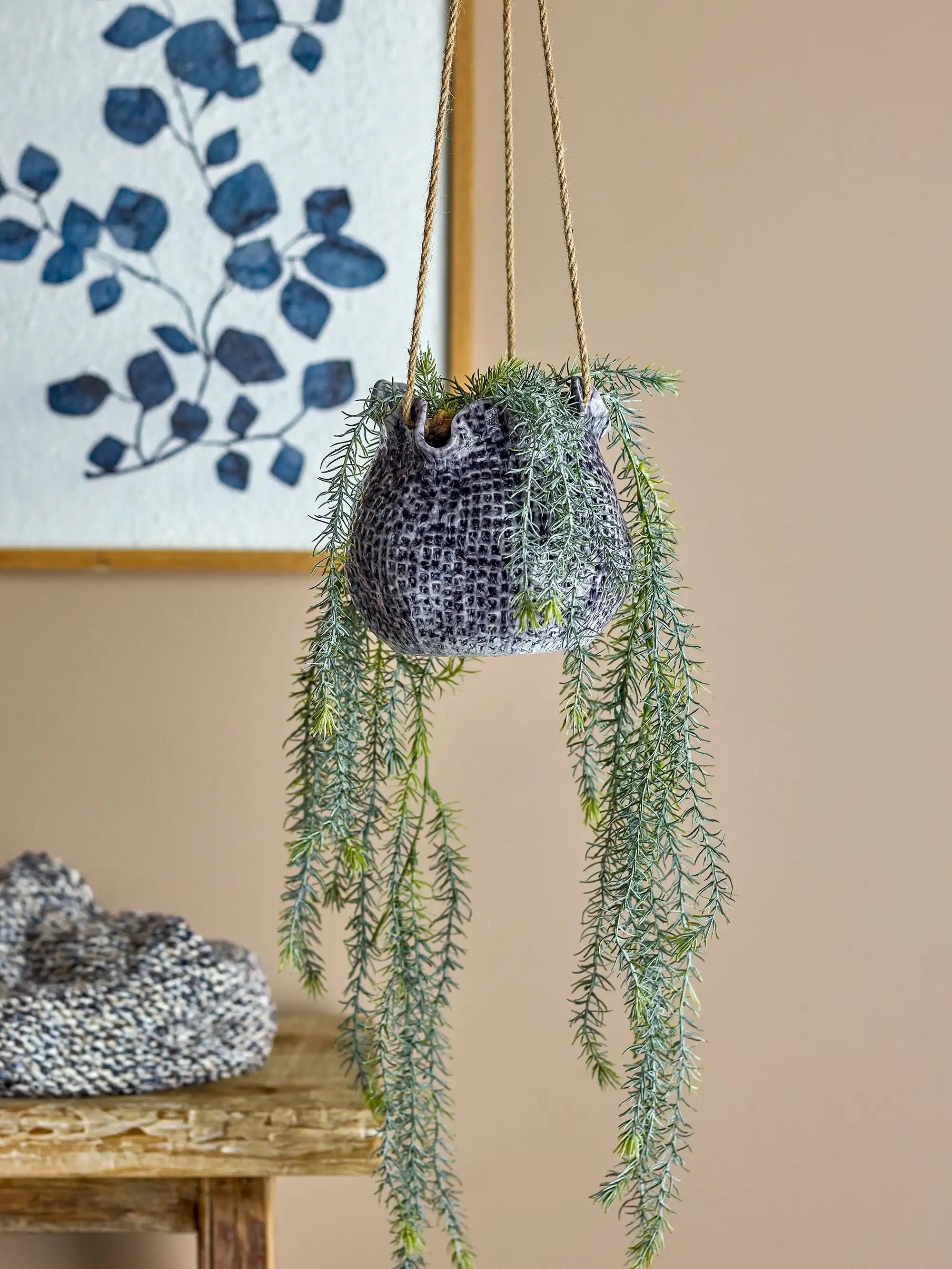 Warum du den Hängeblumentopf von Bloomingville haben möchtest: Dieser Lottie Hängetopf hebt deine Pflanzen buchstäblich hervor und gibt ihnen einen stilvollen Platz in deinem Zuhause. Der gewellte Rand und die dunkle, reaktive Glasur in Blau sorgen für lebendige Nuancen, die wunderschön mit dem Licht spielen. Dank der Juteschnur hängst du sie mühelos vor das Fenster oder in eine vergessene Ecke – genau das Detail, das deinem Interieur Charakter verleiht.