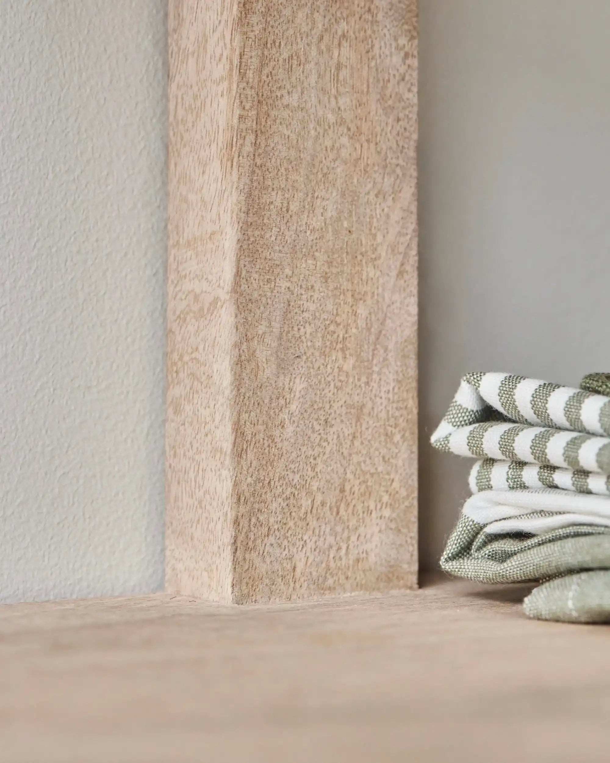 Das Design besteht aus drei stabilen Regalbrettern aus Mangoholz, jedes mit einer natürlichen Oberfläche, die dezent Charakter verleiht. Das Set misst insgesamt 75 cm Breite, 75 cm Höhe und 25 cm Tiefe. Die neutrale Farbpalette macht das Kombinieren mit verschiedenen Stilen einfach, von skandinavisch bis industriell.