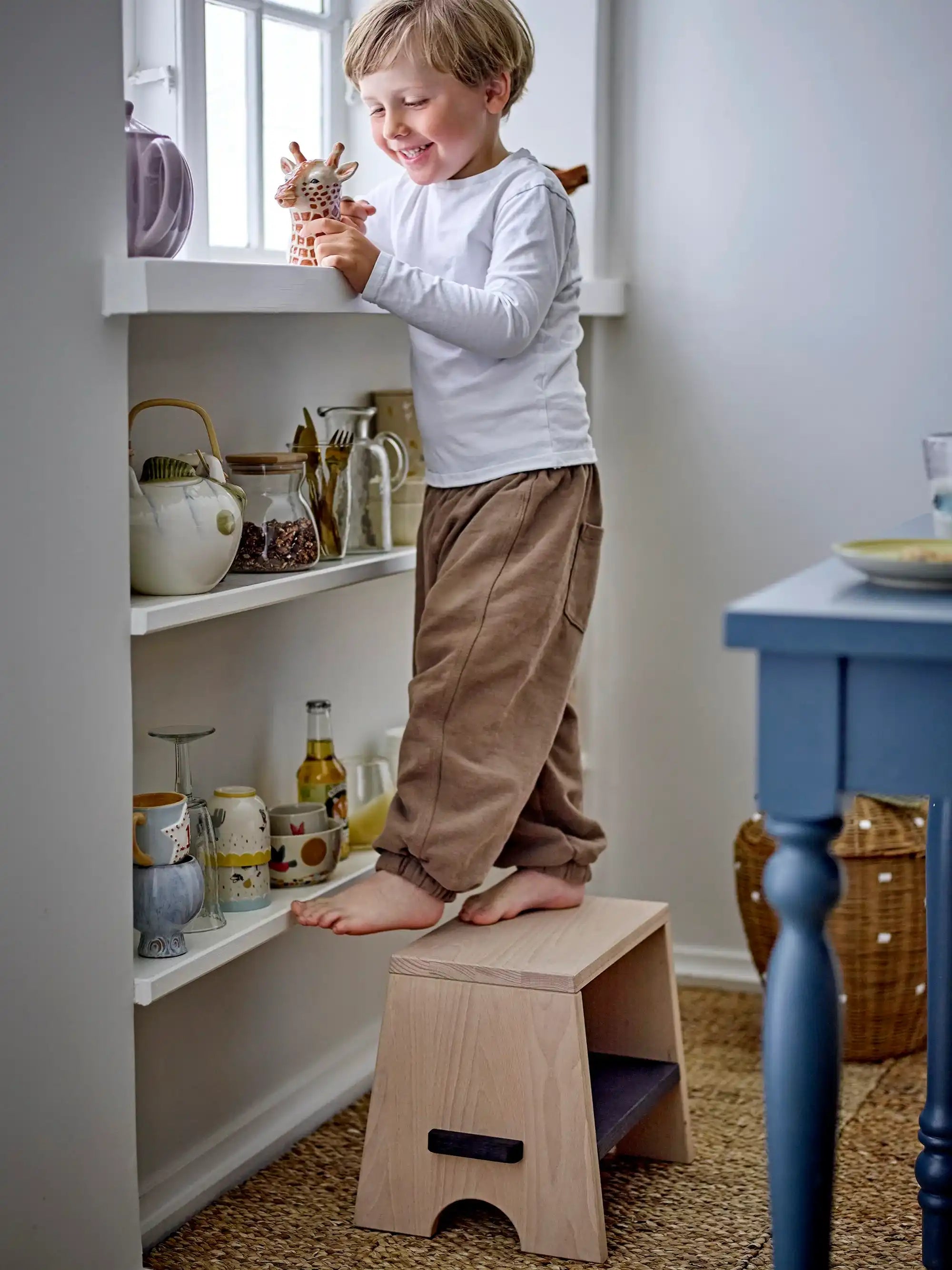 Anwendungstipp: Stelle den Jela Hocker dort auf, wo dein Kind gerade ein wenig Unterstützung braucht: zum Beispiel im Badezimmer oder in der Küche. Nach dem Gebrauch kannst du ihn einfach zur Seite schieben oder unter die Arbeitsplatte stellen. Reinige ihn unkompliziert mit einem trockenen, sauberen Tuch, damit er frisch aussieht. Gib dem Hocker eventuell einen festen Platz, damit dein Kind ihn selbst leicht wiederfindet. Schön zu kombinieren mit anderen hellen Holzmöbeln für eine ruhige Atmosphäre. So fühlt sich dein Kind auf schöne Weise groß.