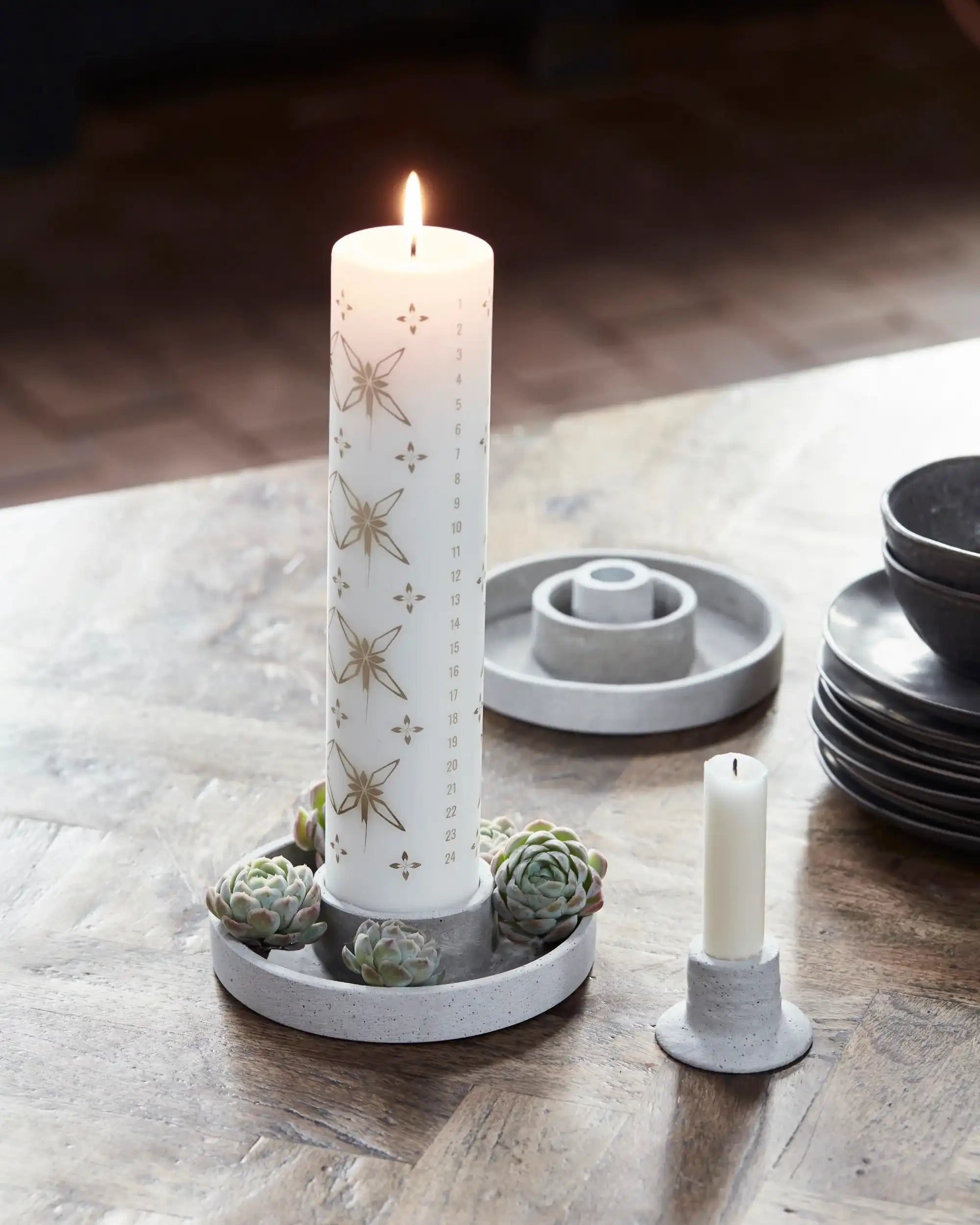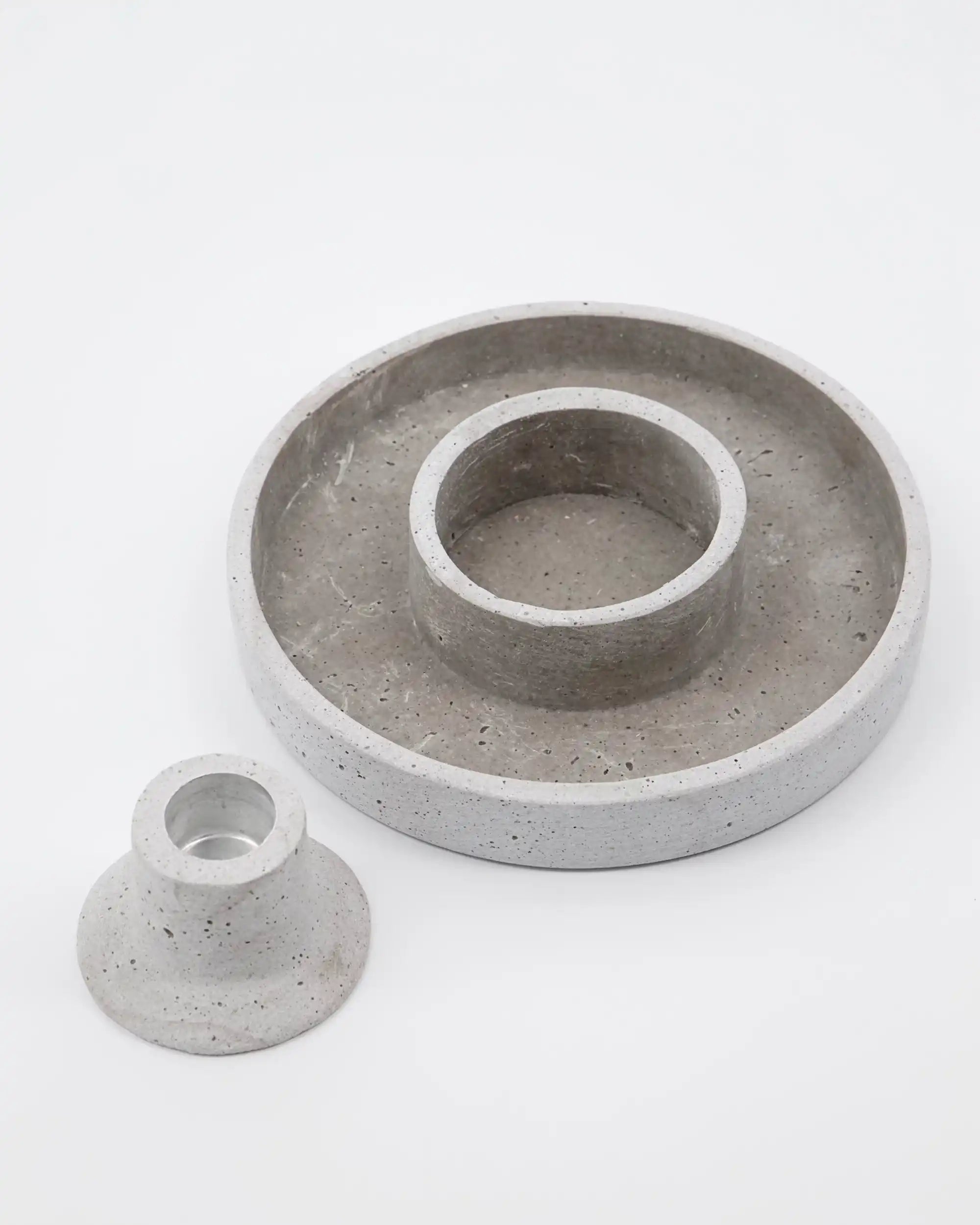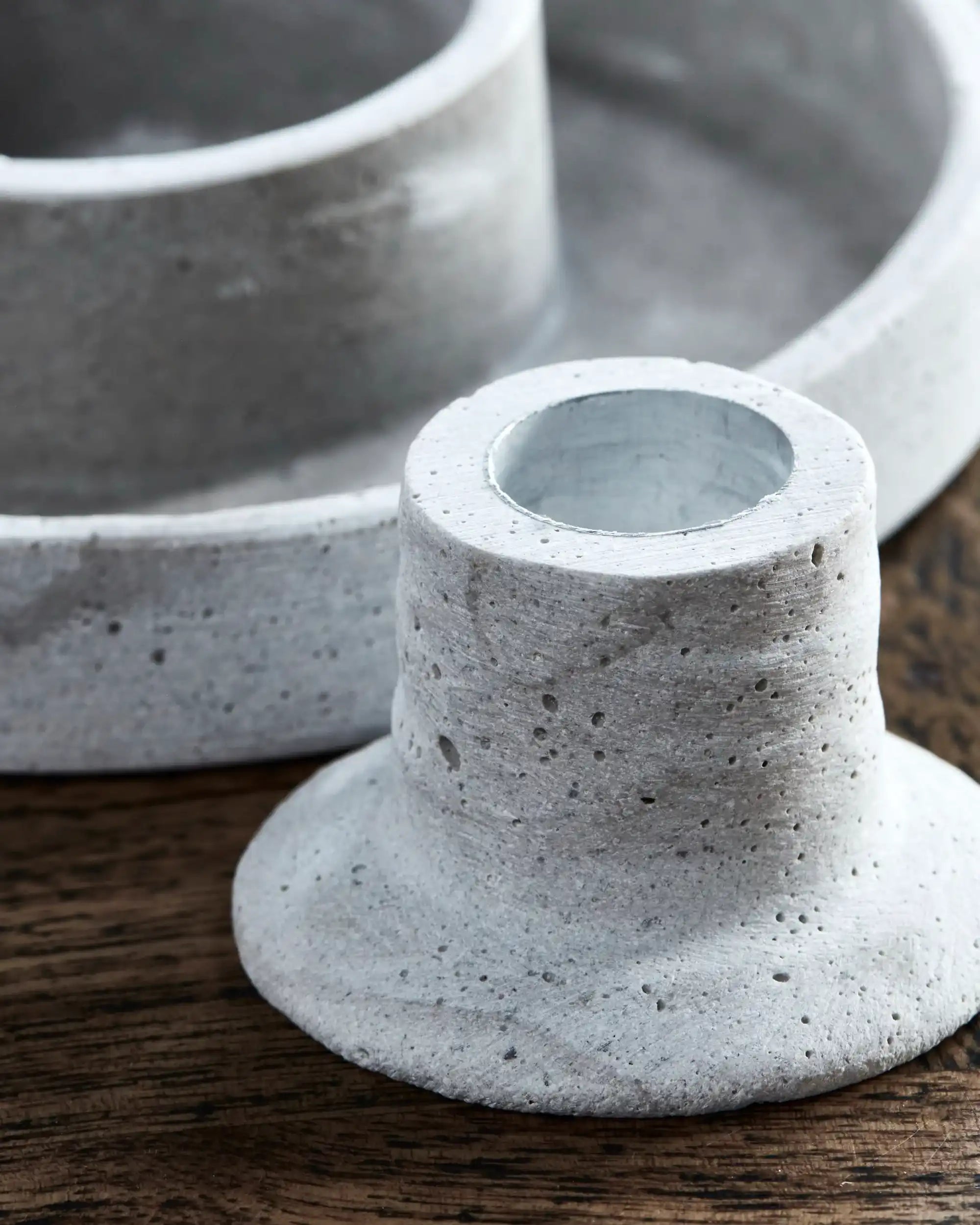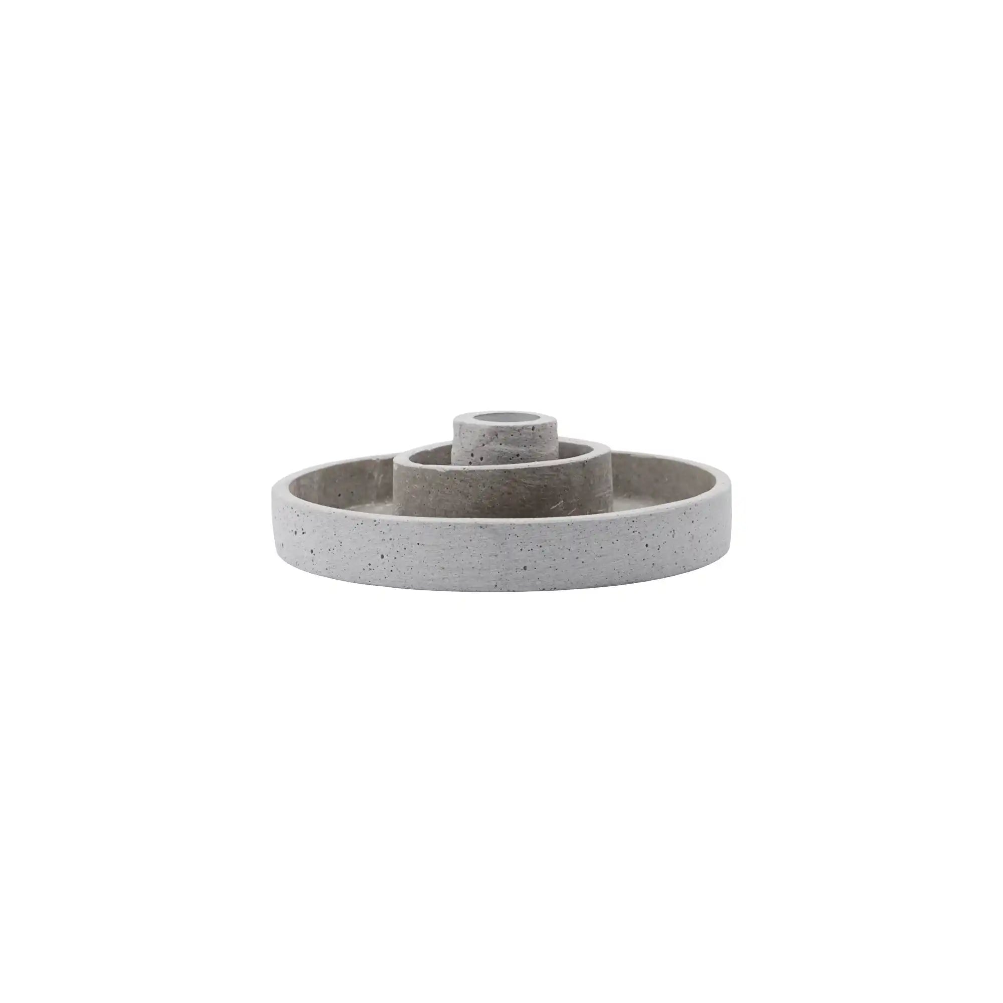 Der Kerzenständer ist aus robustem Polystone gefertigt und in einem sanften Grauton mit natürlicher Betonoptik gehalten. Mit einer Höhe von 4 cm und einem Durchmesser von 15 cm nimmt er wenig Platz ein, bietet aber viele Möglichkeiten. Besonders praktisch ist das clevere, herausnehmbare Innenteil: Damit kannst du Daca sowohl für kleine als auch für große Kerzen verwenden.