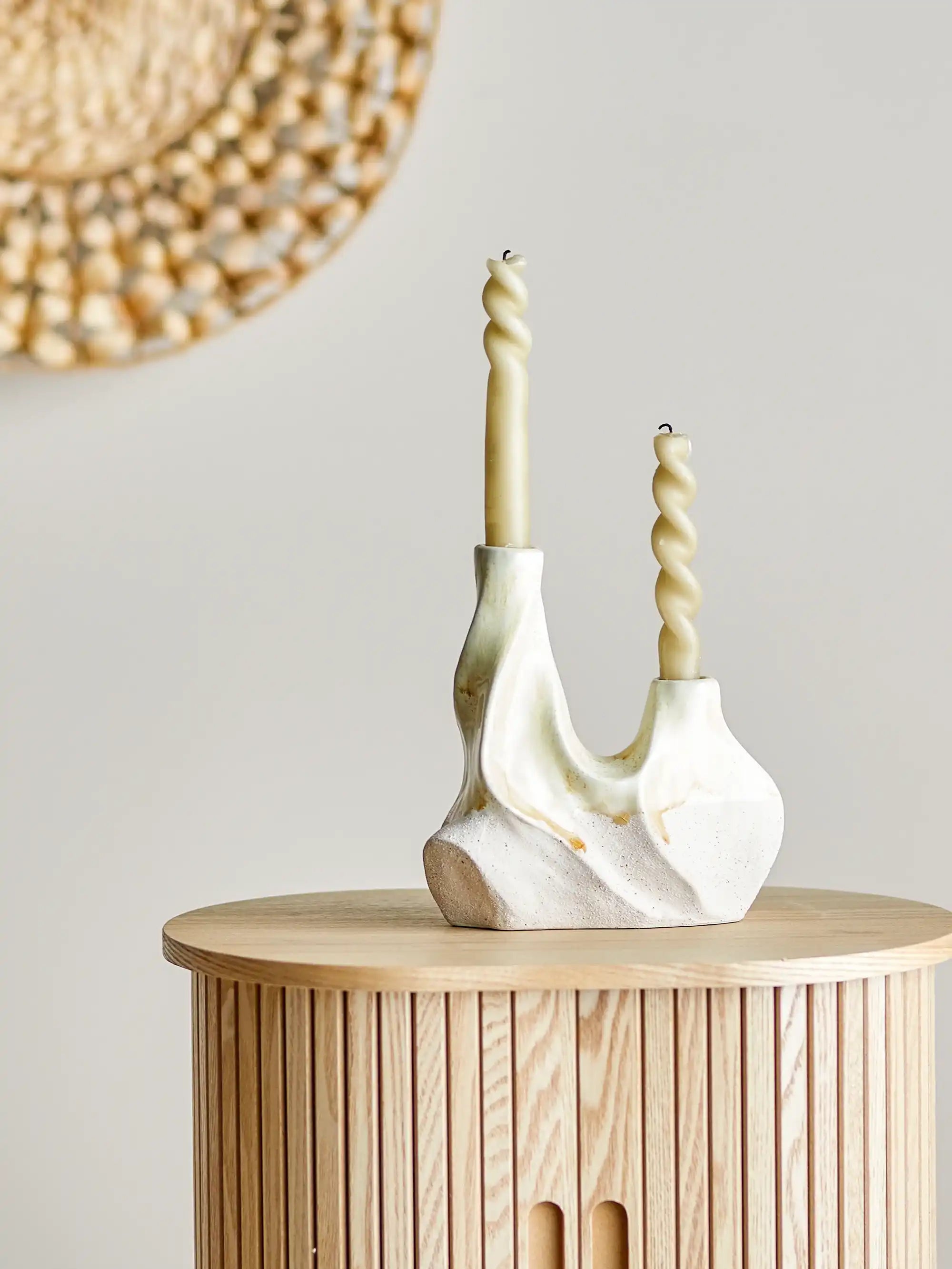 Details & Material: Der Wavy Kerzenhalter besteht aus einer Kombination von glasiertem und unglasiertem Steingut, was für ein besonderes Spiel zwischen matten und glänzenden Texturen sorgt. Dank der Höhe von 19 cm bildet er einen schönen Mittelpunkt auf deinem Esstisch oder Sideboard, während kleine Farb- und Glasurvariationen jeden Kerzenhalter einzigartig machen.