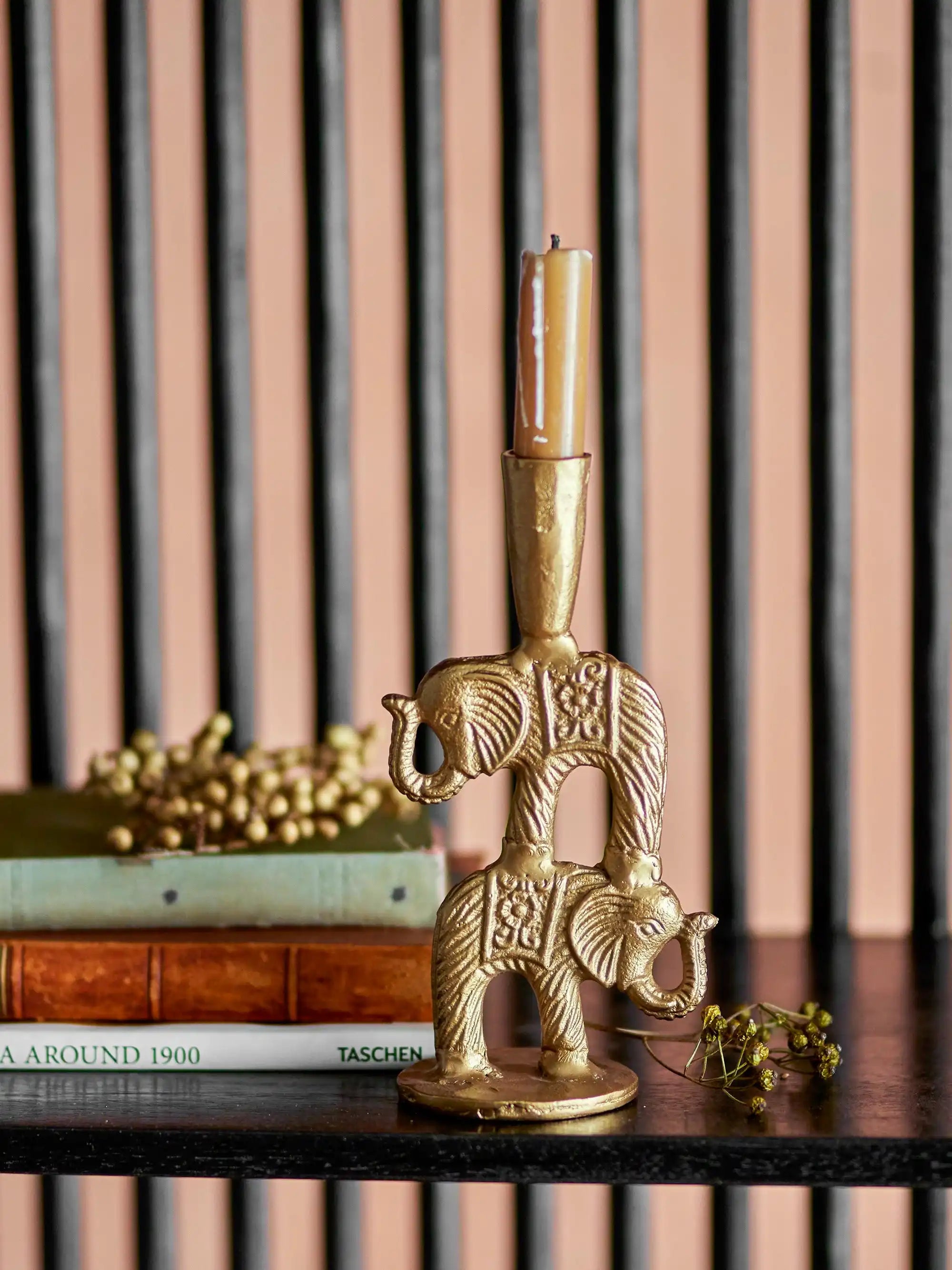 Warum du den Kerzenhalter von Bloomingville haben möchtest: Der Jazz Kerzenhalter ist von indischen Ornamenten inspiriert und bringt Atmosphäre mit zwei niedlichen Elefanten, die anmutig aufeinander stehen. Der messingfarbene Look verleiht einen warmen Glanz und macht dieses kompakte Objekt zu einem stilvollen Akzent für deinen Esstisch, dein Wandregal oder deine Fensterbank. Ob du nun ein intimes Dinner planst oder deine Sitzecke dezent verschönern möchtest, dieser Kerzenhalter fügt Humor und Eleganz hinzu, ohne aufdringlich zu wirken.