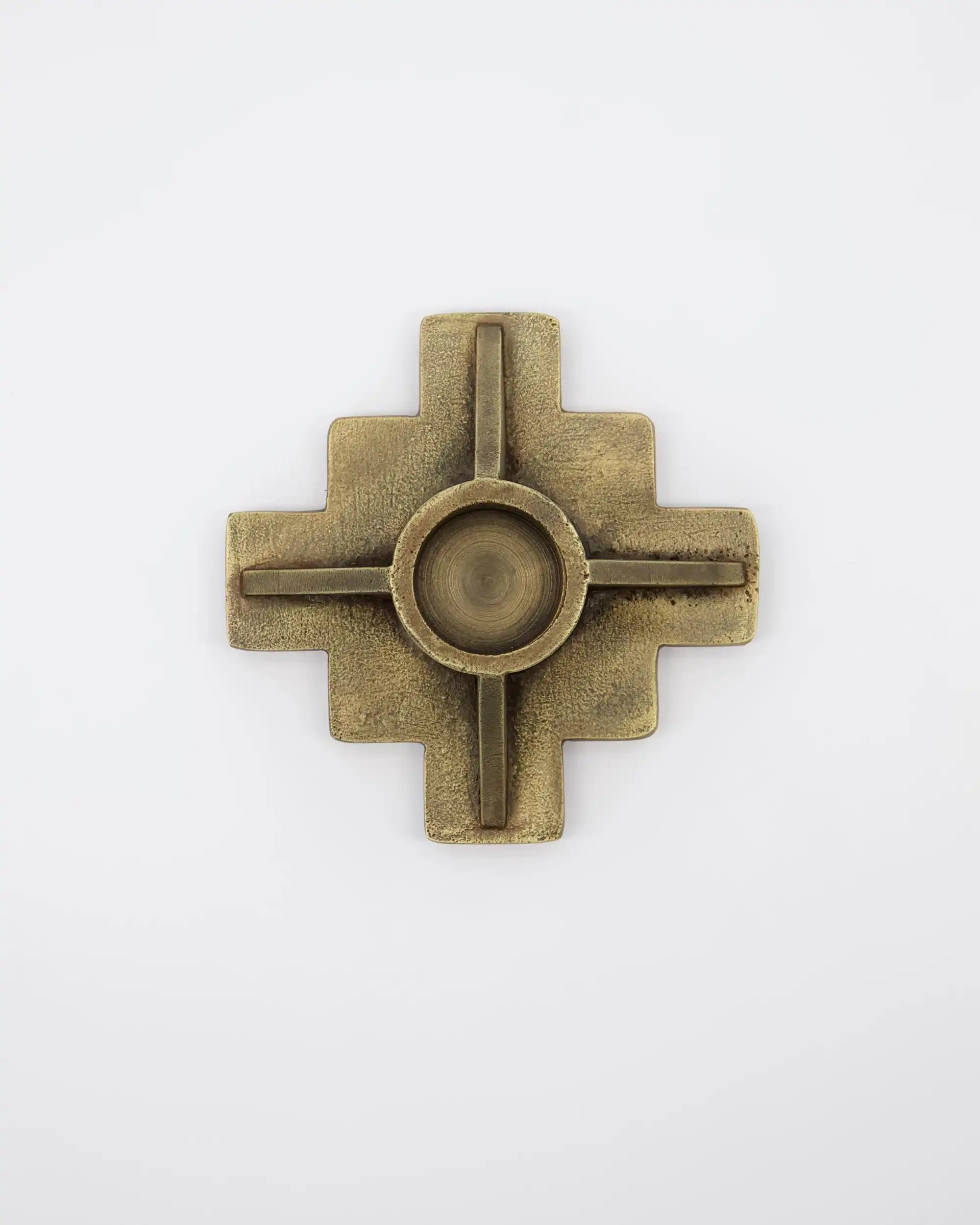 Der Kerzenhalter besteht aus Aluminium mit einer antik bronzenen Oberfläche, die den rauen Charakter des Materials schön zur Geltung bringt. Mit seinen Maßen von 15,4 x 15,4 cm und einer Höhe von 6,4 cm ist er kompakt, aber dennoch ein Blickfang. Geeignet für Stumpenkerzen mit einem Durchmesser von 4 cm.