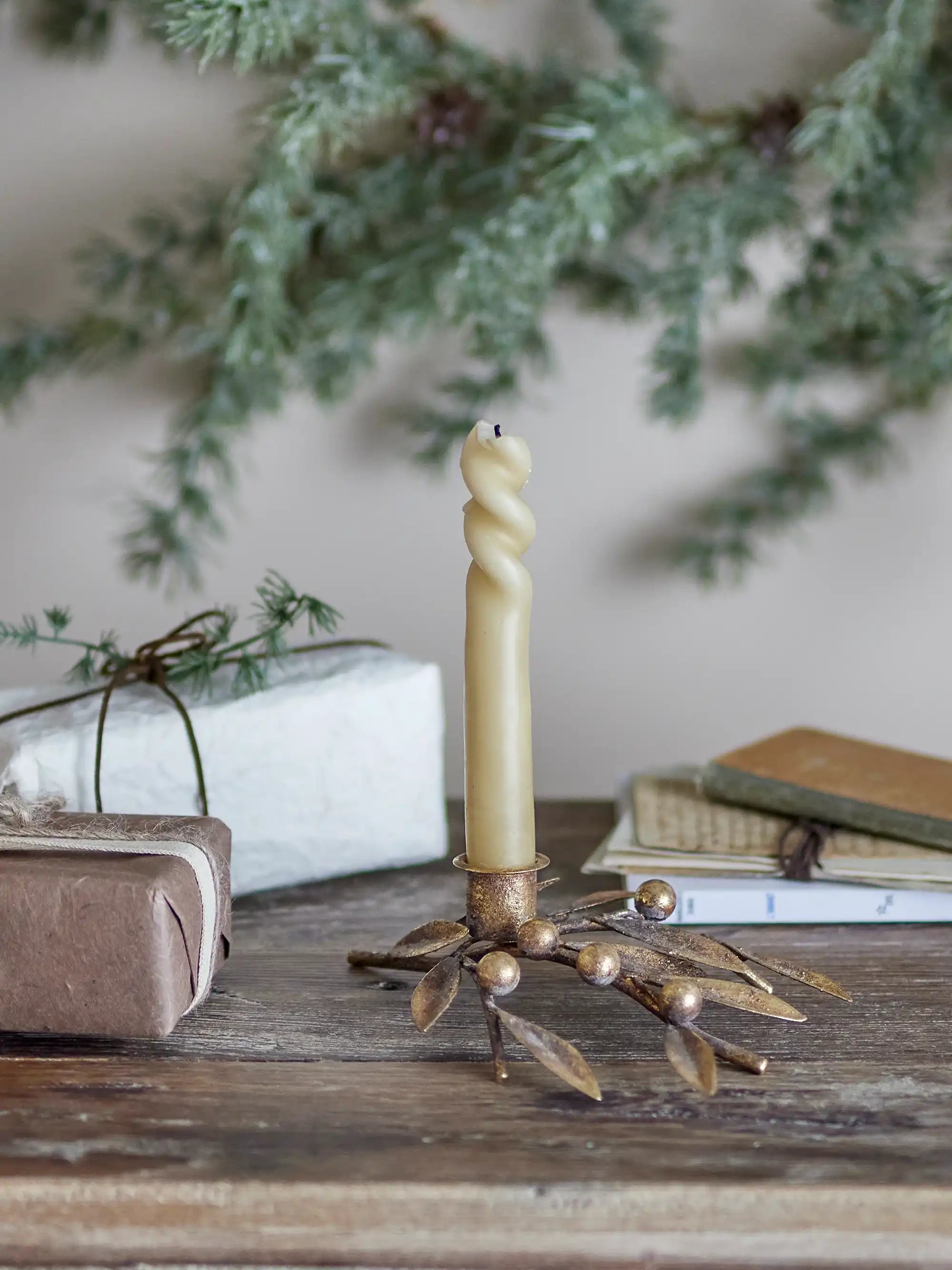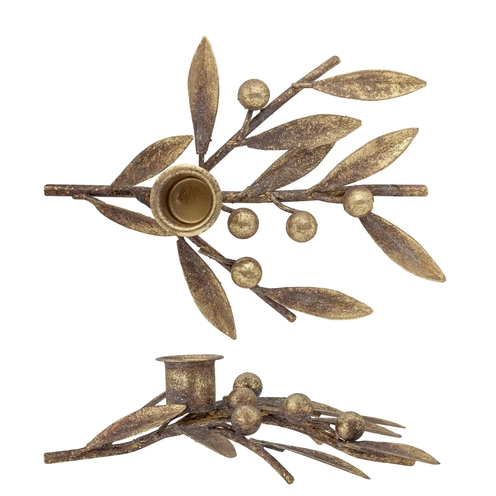 Details & Material: Der Kerzenhalter besteht aus robustem Metall und ist in einem wunderschön patinierten Goldton gehalten. Das raffinierte Design ist von Mistelblättern und -beeren inspiriert, wodurch das Objekt sowohl verspielt als auch elegant wirkt. Mit seinen Maßen von 18 x 13 x 5 cm kannst du ihn ganz einfach auf dem Esstisch, Sideboard oder Fensterbrett platzieren und so für das gewisse Extra an Atmosphäre sorgen.
