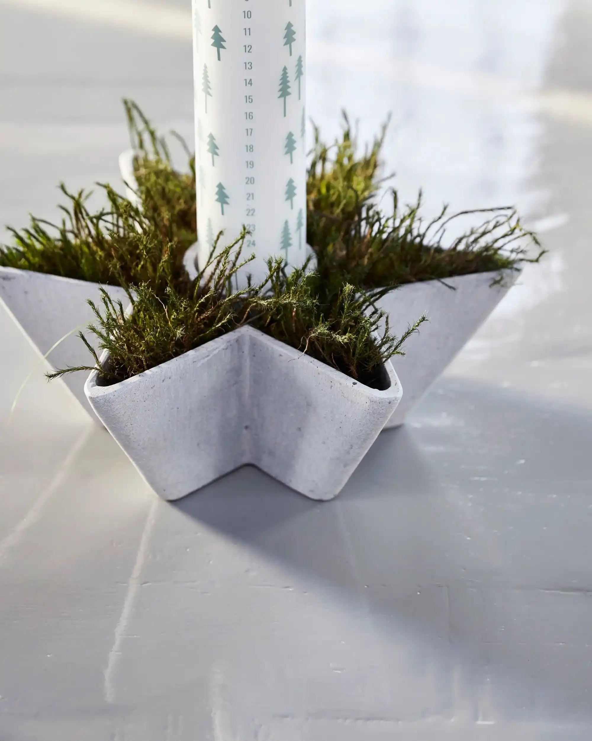Gefertigt aus grauem Polystone erhält der Kerzenhalter eine markante Zementoptik, die wunderbar mit natürlichen Materialien wie Holz oder Glas harmoniert. Mit seinen Maßen von 30,5 cm Länge, 27 cm Breite und 10,5 cm Höhe ist er großzügig genug für eine große Stumpenkerze. In der Aussparung rund um die Kerze ist Platz für Dekoration nach deinem Geschmack – ob Grün, Girlanden oder ganz dezent.
