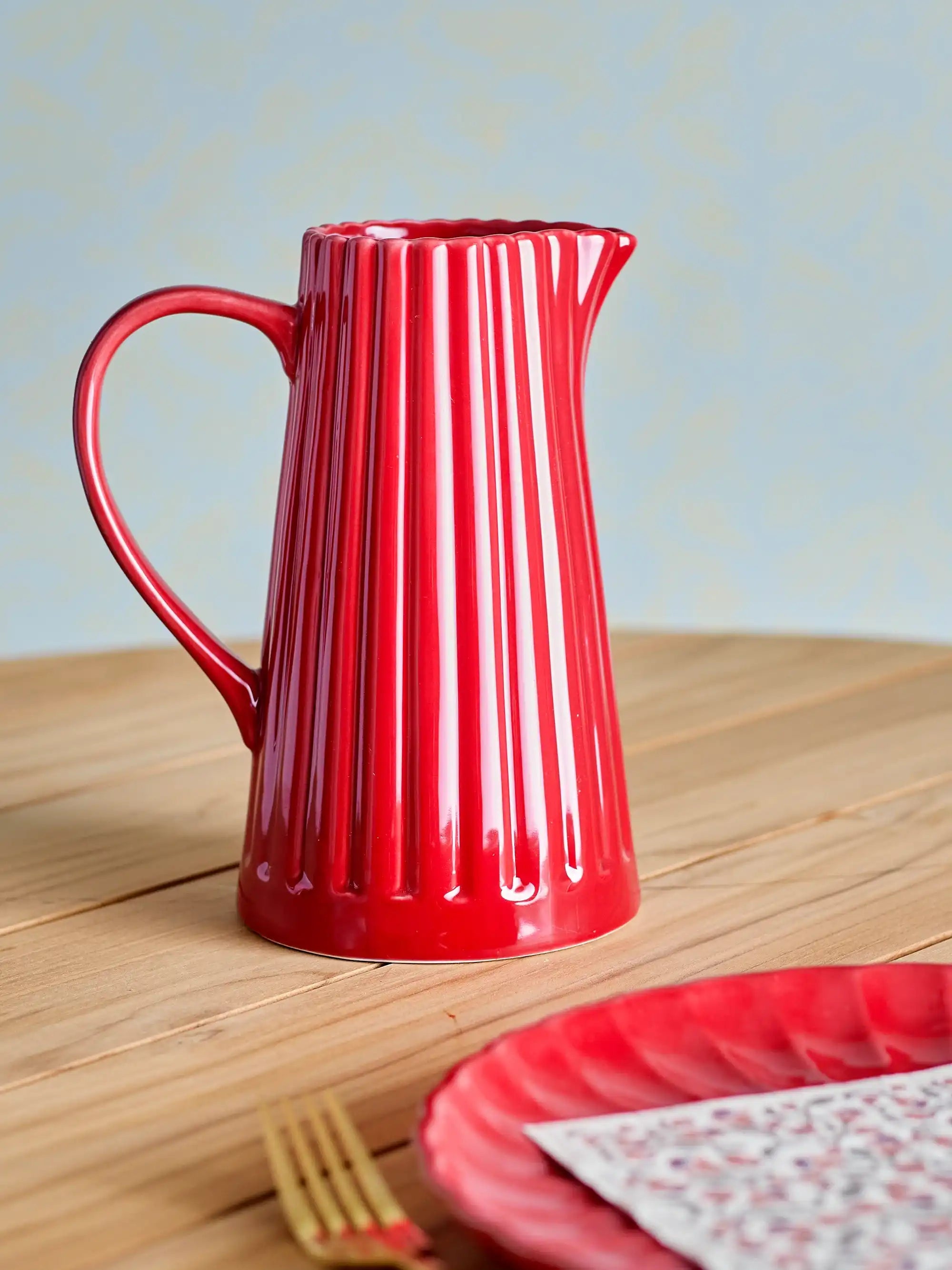 Eleganz & einzigartiges Material: Die kräftige rote Glasur auf dem robusten Steingut macht jede Karaffe einzigartig und sorgt für einen wunderschönen Blickfang. Die vertikalen Linien, dezent im Design verarbeitet, betonen die elegante Form, während das großzügige Format (25 cm hoch, 20 cm Durchmesser) sowohl praktisch als auch schön ist. Dank des abgerundeten Henkels liegt die Karaffe zudem angenehm in der Hand.