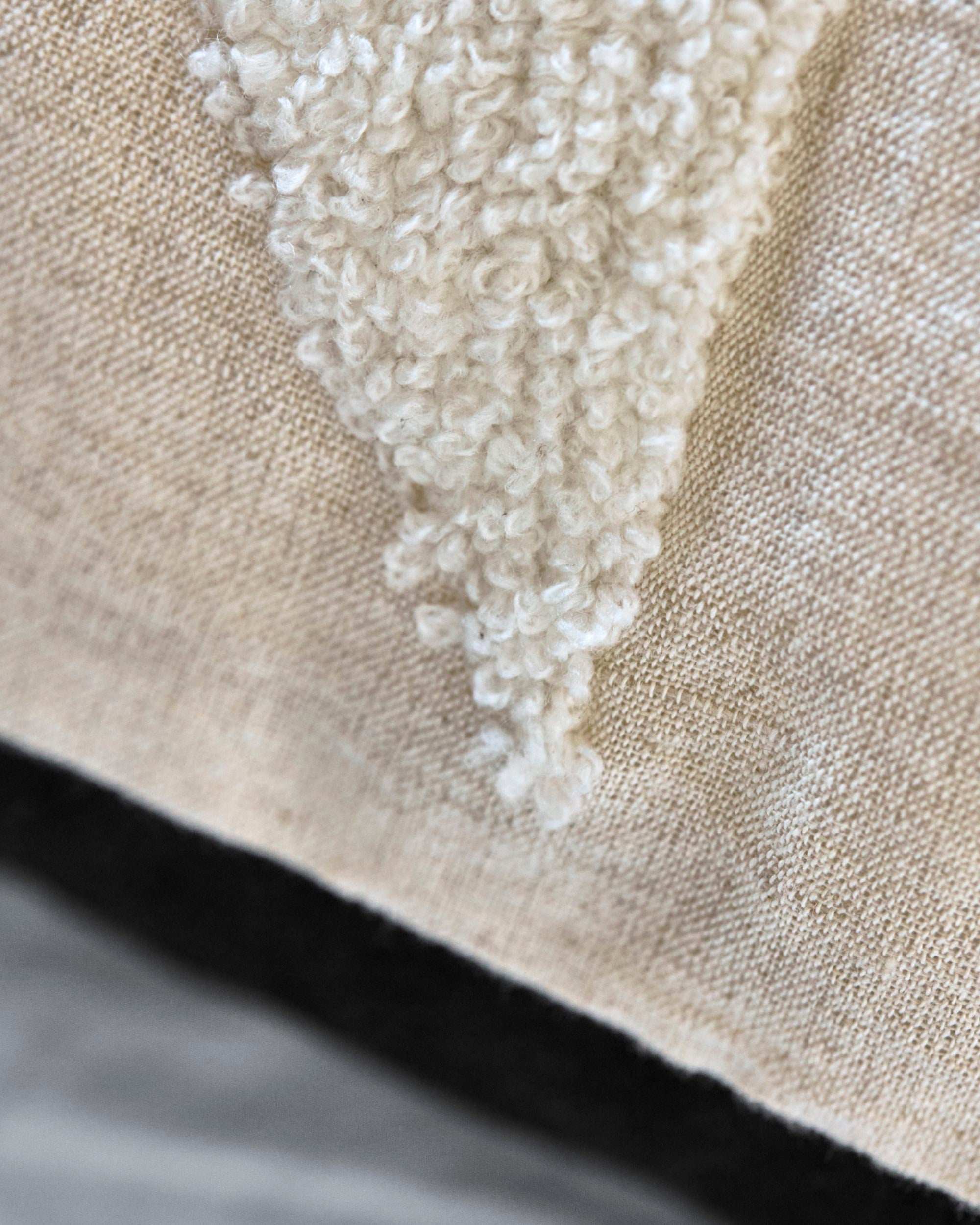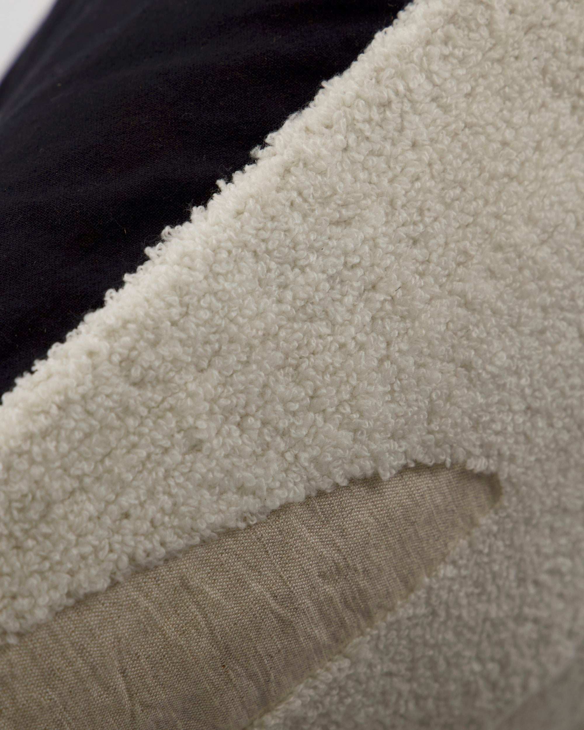 Die Rückseite ist aus einfarbig schwarzer Baumwolle gefertigt, was für einen schönen Kontrast und eine stabile Basis sorgt. Dieser Bezug lässt sich mühelos mit anderen Kissen in natürlichen Tönen kombinieren und verleiht deinem Sofa, Sessel oder Bett einen ruhigen, grafischen Akzent.
