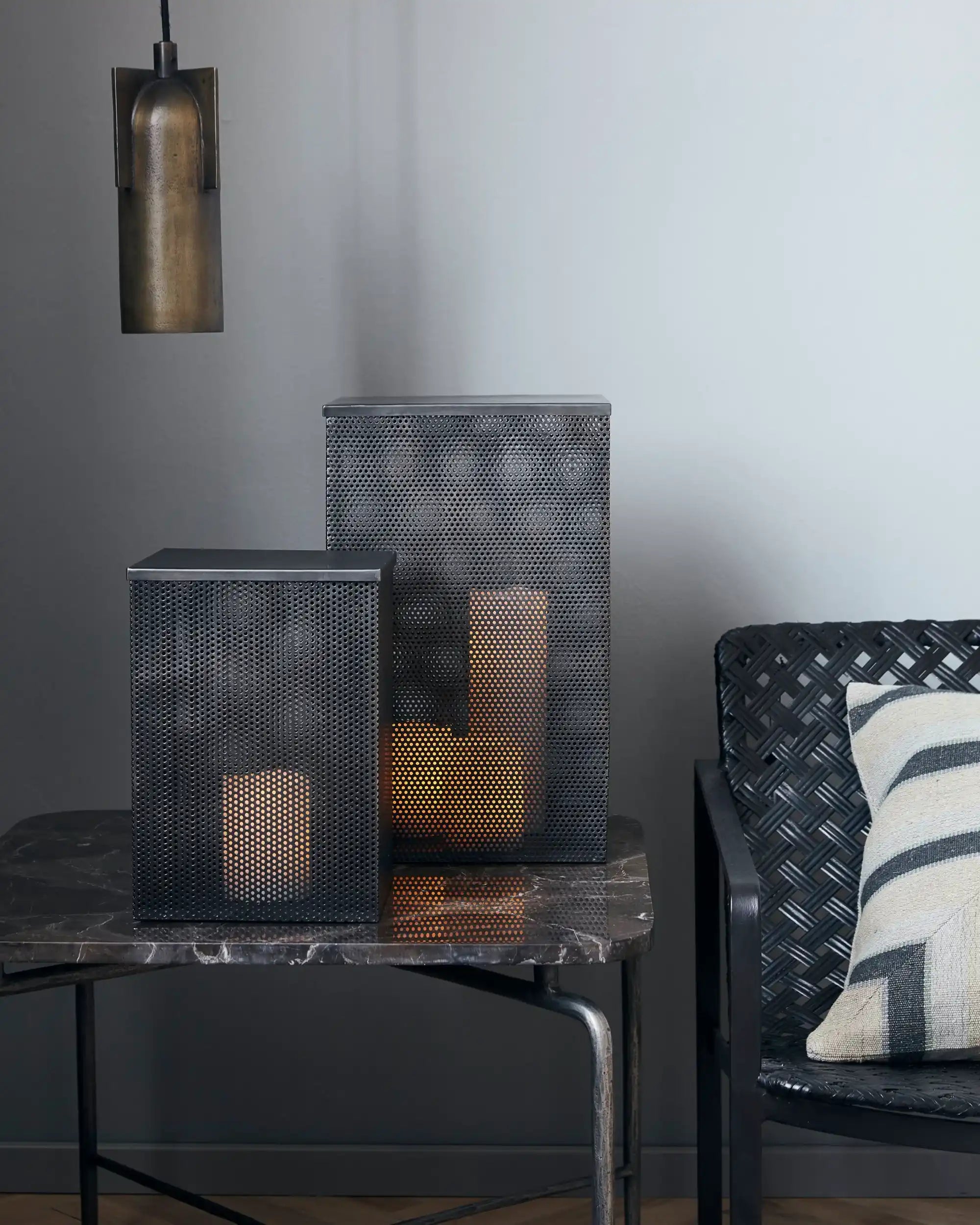 Diese Laterne besteht aus robustem Metall und ist in einem tiefen, mattschwarzen Farbton gehalten. Die luftige Form und das minimalistische Design verleihen ihr einen modernen Look mit industriellem Touch. Es gibt sie in zwei Größen: Die kleine Variante misst 20,5 x 20,5 x 28 cm, die große Version ist 25,5 x 25,5 x 41 cm. Perfekt, um sie als Duo zu arrangieren oder einzeln zu platzieren.
