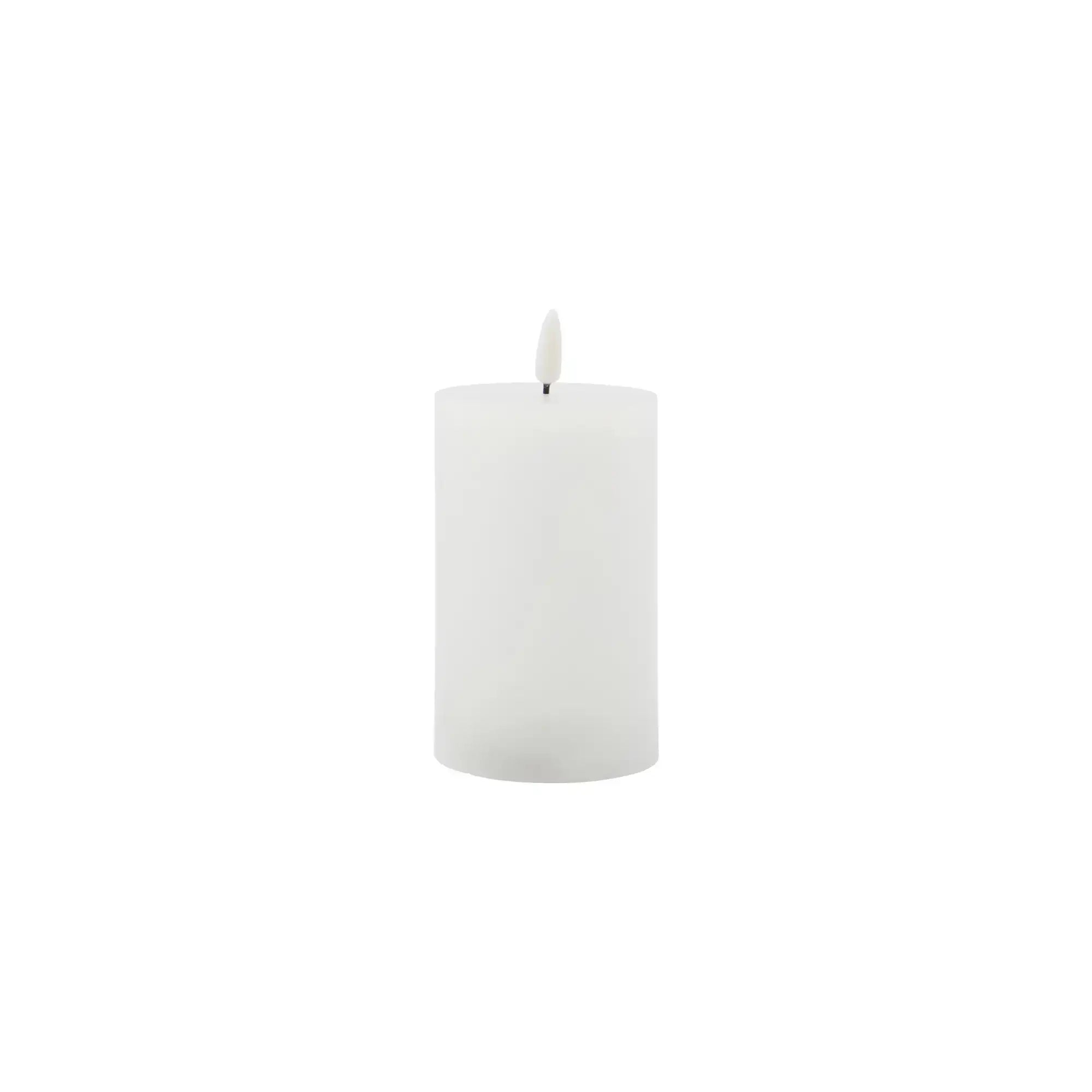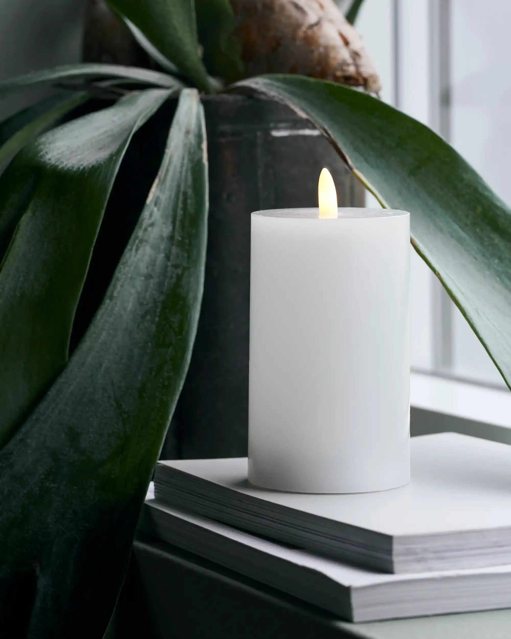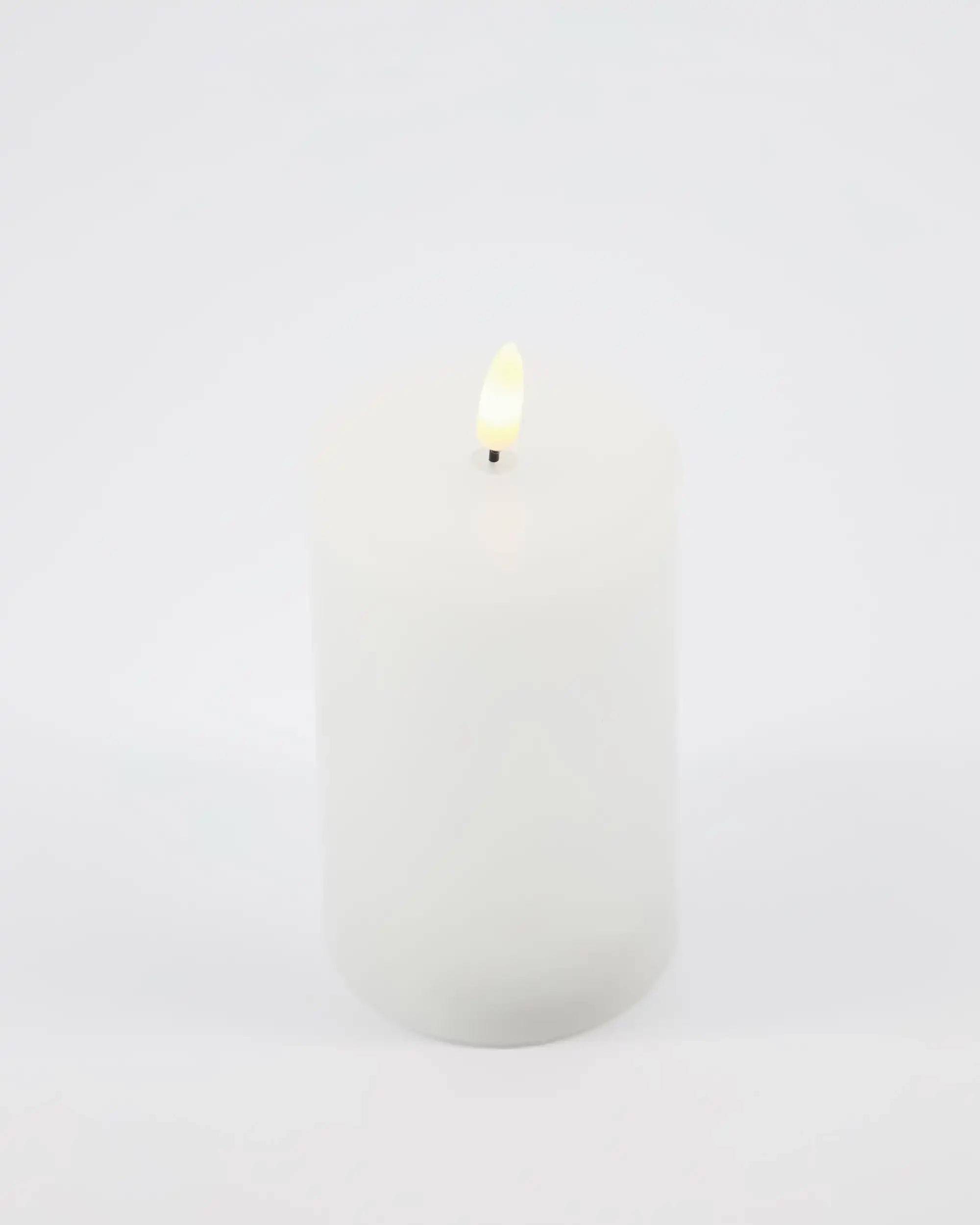 Die Kerze besteht aus Paraffin und hat eine sanft weiße Oberfläche, die sich wie echtes Wachs anfühlt. Mit einer Höhe von 12,5 cm und einem Durchmesser von 7,5 cm ist sie mittelgroß und macht sich besonders gut in Laternen oder auf Tabletts. Die warm bewegende Flamme wirkt überraschend realistisch – ideal für eine entspannte Atmosphäre zu Hause.