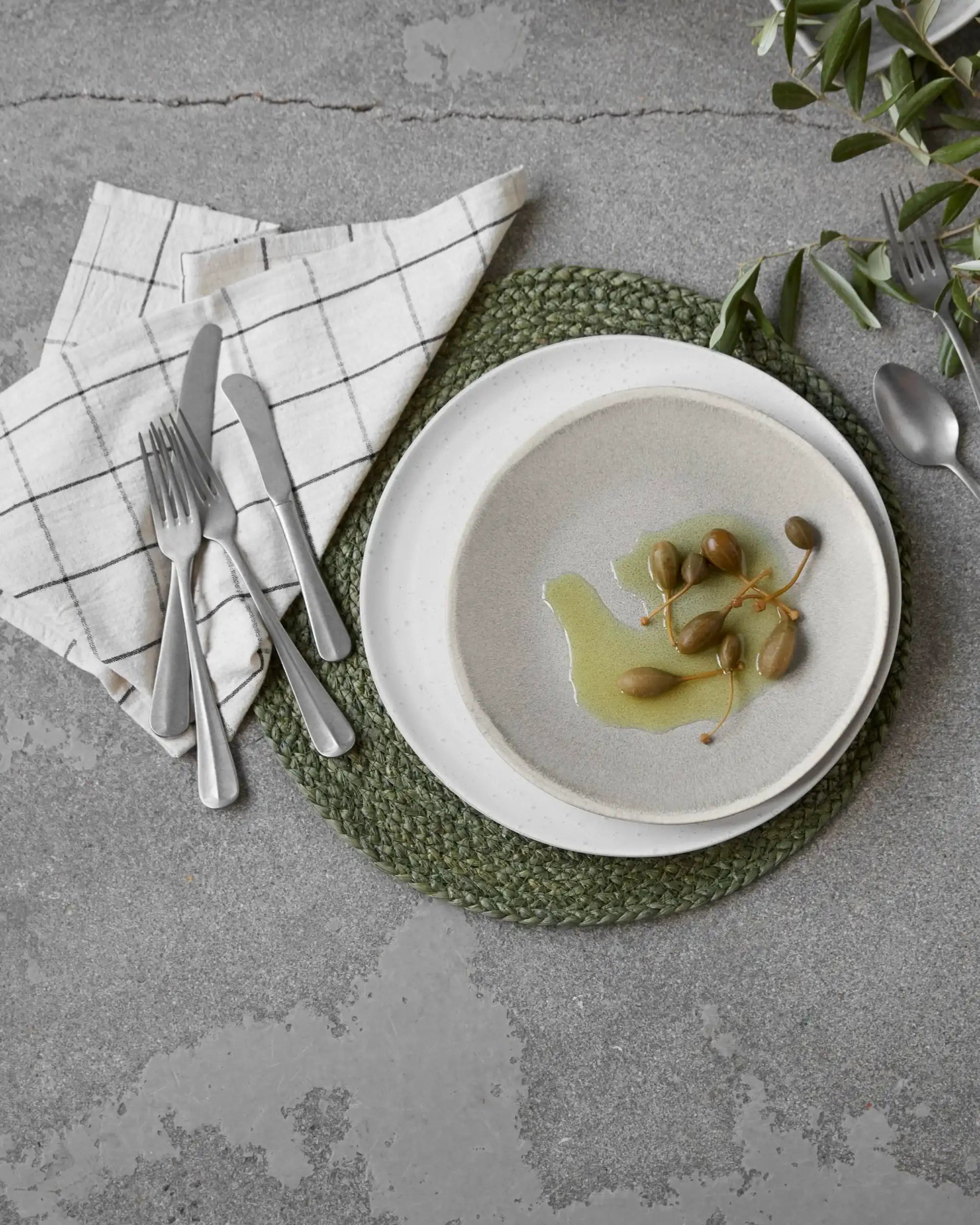 Der Teller besteht aus langlebigem Steingut mit matter grauer Oberfläche. Die Maße sind Ø 23 cm und Höhe 2,2 cm – groß genug für belegte Brötchen oder einen frischen Salat. Die subtile Unvollkommenheit in der Form verleiht jedem Stück einen einzigartigen Charakter, ohne auf Benutzerfreundlichkeit zu verzichten.