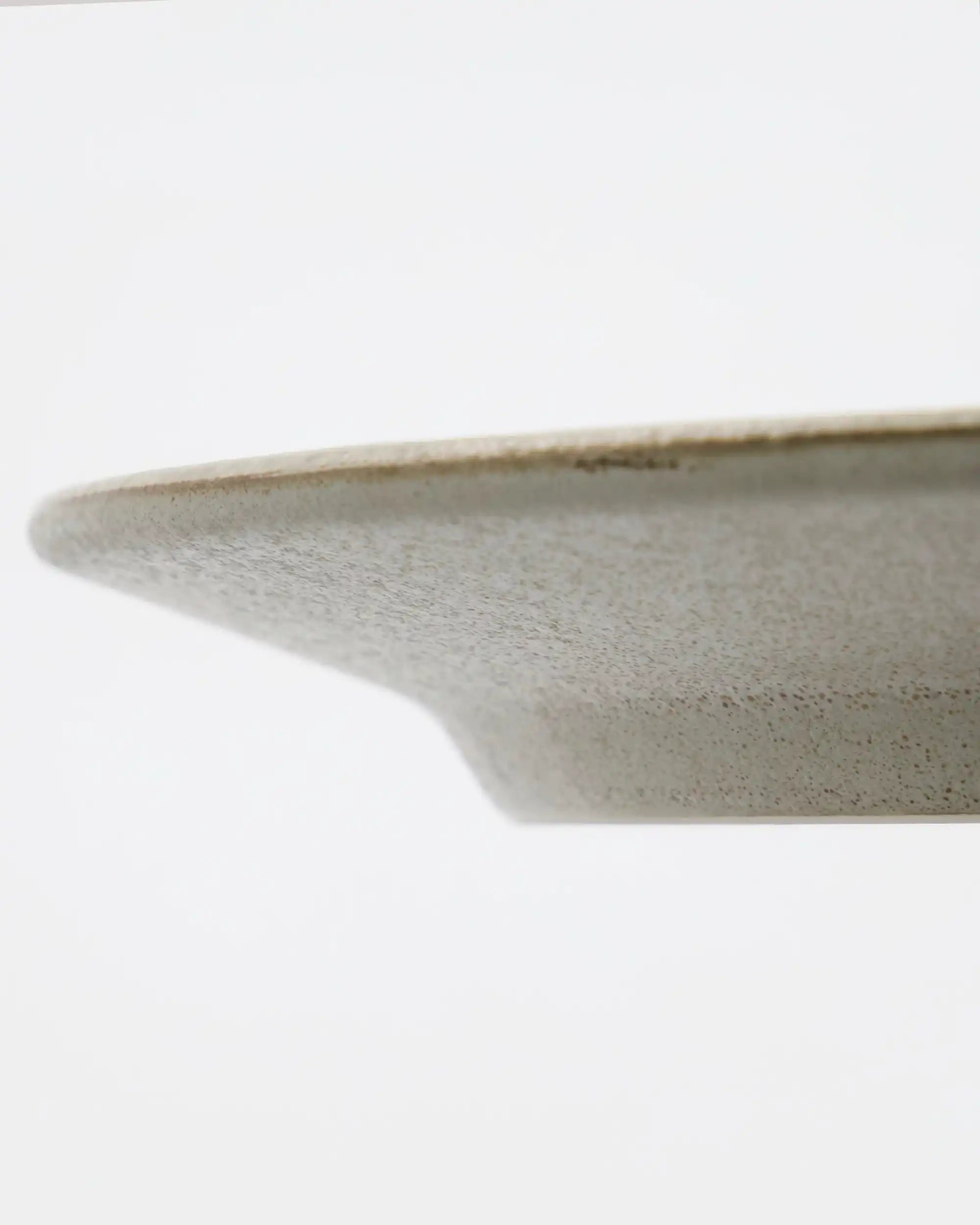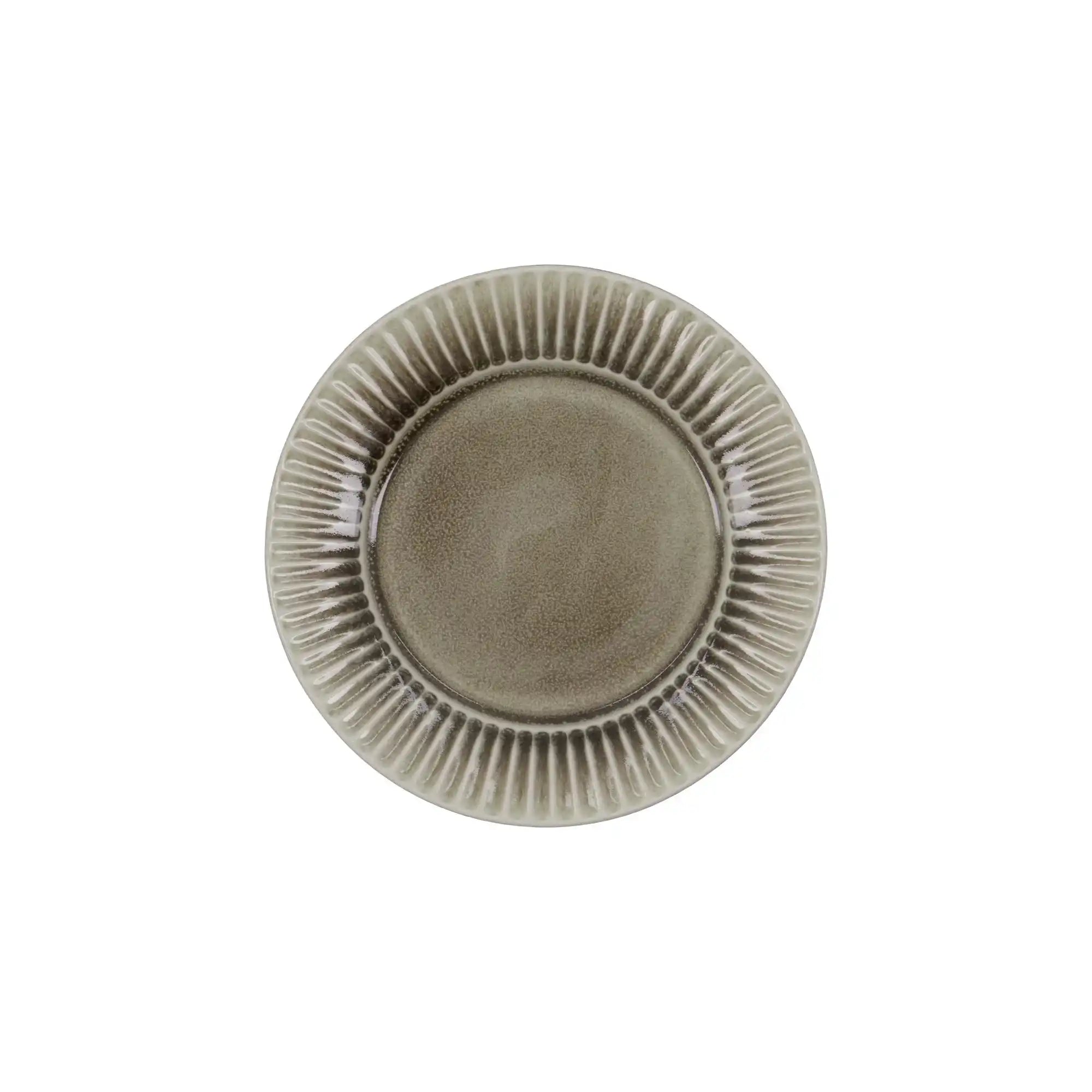 Der Teller besteht aus Steingut und hat eine feine, gerillte Struktur an der Außenseite. Die Außenseite ist matt, während die Innenseite dezent glänzt – eine elegante Kombination, die durch ihre Schlichtheit besticht. Mit einem Durchmesser von 22 cm und einer Höhe von 2 cm ist dieser Teller ideal für ein leichtes Mittagessen, Frühstück oder einen Snack.