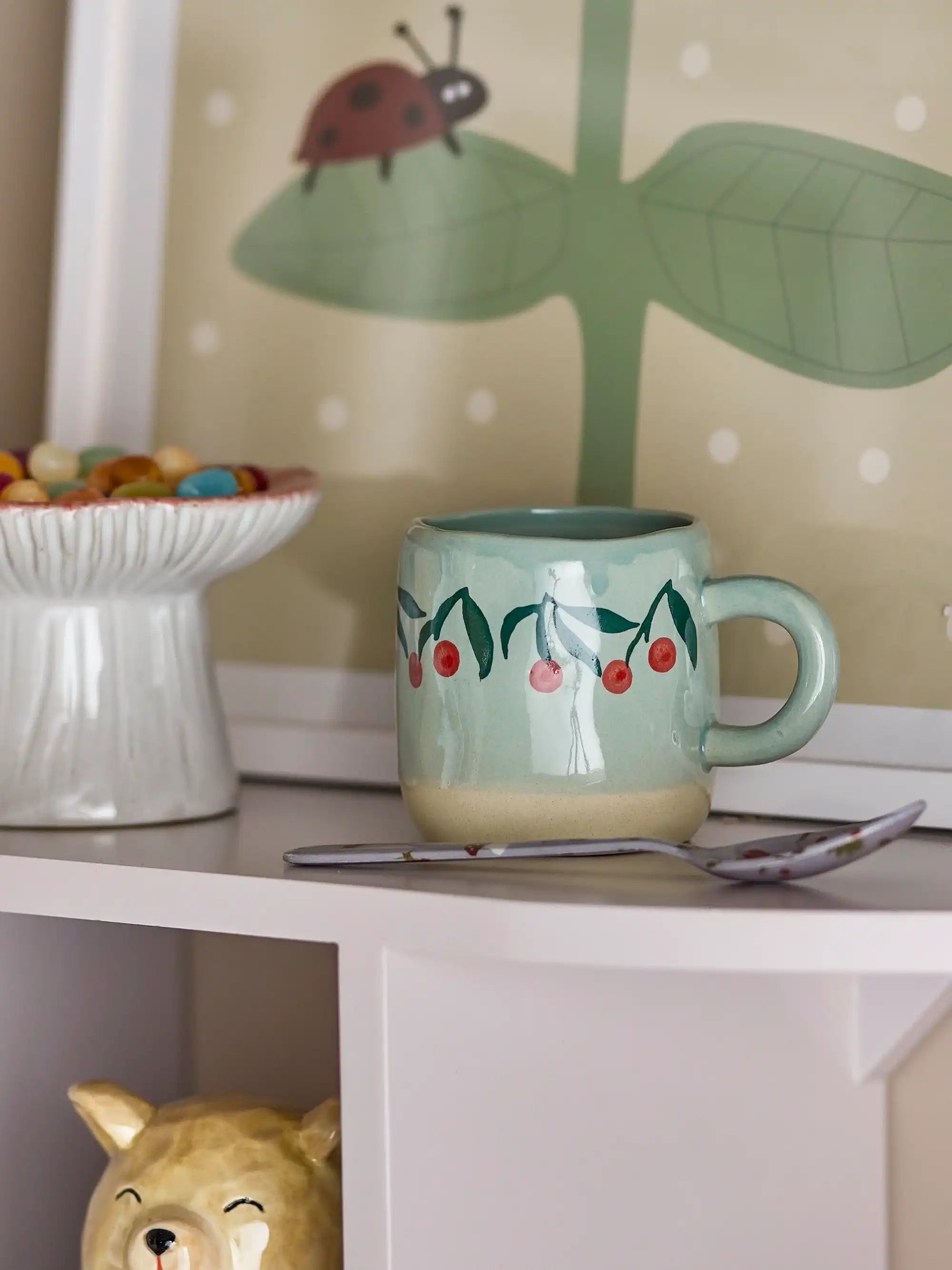 Details & Material: Die Tasse besteht aus robustem Steingut und liegt gut in der Hand. Mit einem Durchmesser von 6 cm ist sie schön kompakt und daher leicht für kleine Hände zu greifen. Die Kirschen sind von Hand gemalt, sodass jede Tasse ein Unikat ist. Das macht dein Geschirr verspielt und einzigartig.