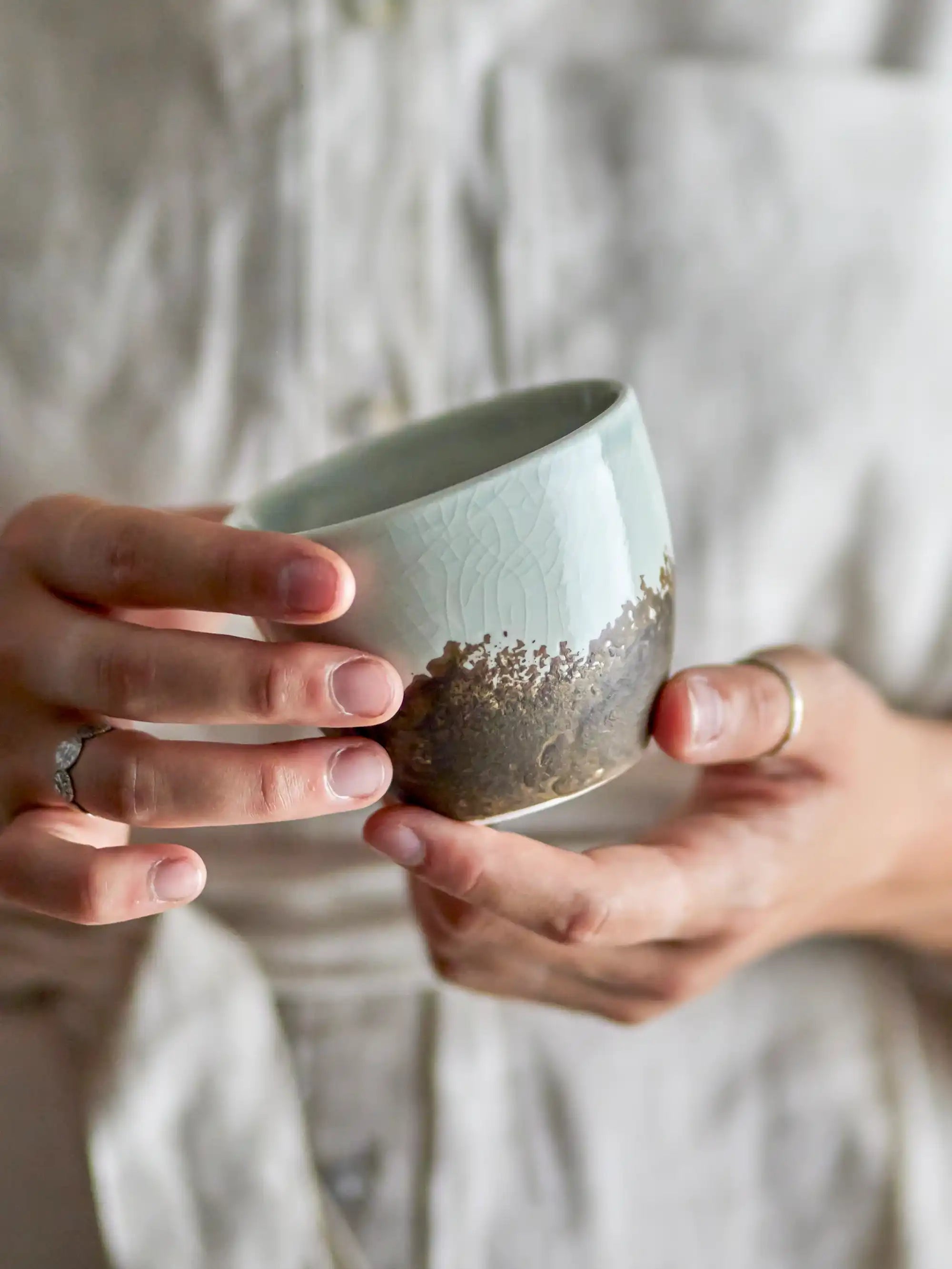 Stilvolles Design und praktisches Material: Der Becher ist aus robustem Steingut gefertigt und mit einer von Hand aufgetragenen Glasur in Braun und dezenten Blautönen versehen. Da er keinen Henkel hat, lässt er sich perfekt stapeln und spart so Platz im Küchenschrank. Der Durchmesser von 8 cm und die Höhe von 7 cm sorgen für ein angenehmes Fassungsvermögen – perfekt für den täglichen Gebrauch.